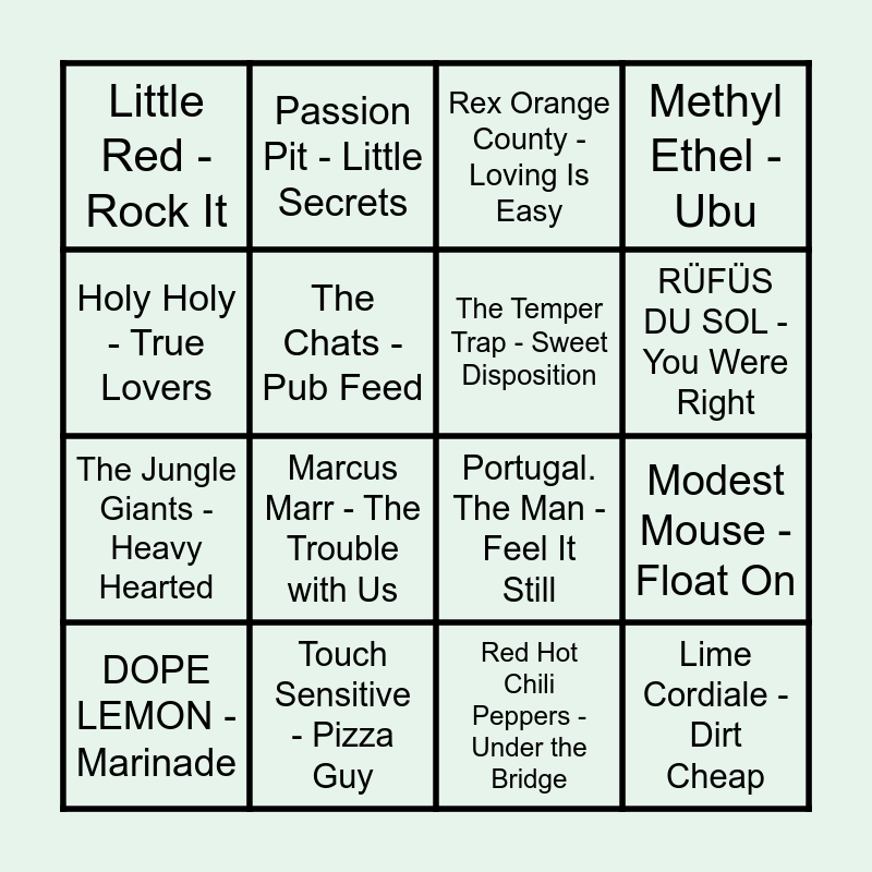 This bingo card has 61 words: Ocean Alley - Knees, Sticky Fingers - Australia Street, BENEE - Find an Island, Lime Cordiale - Dirt Cheap, San Cisco - Awkward, Mac DeMarco - Chamber Of Reflection, The Temper Trap - Sweet Disposition, Spacey Jane - Lots of Nothing, The Jungle Giants - Heavy Hearted, Tame Impala - The Less I Know The Better, Methyl Ethel - Ubu, Winston Surfshirt - Be About You, The Chats - Pub Feed, Violent Soho - Covered in Chrome, Ocean Alley - Confidence, Little Red - Rock It, DOPE LEMON - Marinade, Holy Holy - True Lovers, Flight Facilities - Crave You, RÜFÜS DU SOL - You Were Right, Touch Sensitive - Pizza Guy, Rex Orange County - Loving Is Easy, Weezer - Island In The Sun, Phoenix - 1901, Gang of Youths - Let Me Down Easy, Ou Est Le Swimming Pool - Dance The Way I Feel, Ladyhawke - My Delirium, Ball Park Music - Exactly How You Are, Marcus Marr - The Trouble with Us, Foals - My Number, Edward Sharpe & The Magnetic Zeros - Home, The Kooks - Naive, Chance the Rapper - All Night (feat. Knox Fortune), Jack River - Fool's Gold, Passion Pit - Little Secrets, M83 - Midnight City, The Strokes - Last Nite, Modest Mouse - Float On, Two Door Cinema Club - What You Know, Portugal. The Man - Feel It Still, Prince - I Wanna Be Your Lover, John Mayer - Your Body Is a Wonderland, Red Hot Chili Peppers - Under the Bridge, INXS - New Sensation, Violent Femmes - Blister In The Sun, The Darkness - I Believe in a Thing Called Love, The Killers - Mr. Brightside, The Clash - Rock the Casbah - Remastered, Gorillaz - Feel Good Inc., Jet - Are You Gonna Be My Girl, blink-182 - What's My Age Again?, Khalid - Talk, Bruno Mars - That's What I Like, Paul Simon - You Can Call Me Al, Fleetwood Mac - Dreams - 2004 Remaster, M.I.A. - Paper Planes, The Buggles - Video Killed The Radio Star, Franz Ferdinand - Take Me Out, Spacey Jane - Booster Seat, Doja Cat - Kiss Me More (feat. SZA) and Powderfinger - My Happiness.