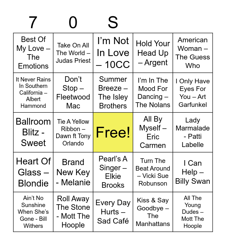 This bingo card has a free space and 90 words: Give Me A Little More Time – Chairman Of The Board, Suicide Is Painless - The Ron Hicklin Singers, Pearl’s A Singer – Elkie Brooks, Love Train – The O’Jays, The Most Beautiful Girl In The World – Charlie Rich, War - Edwin Starr, Staying Alive – Bee Gees, Blame It On The Boogie – The Jackson 5, If You Don’t Know Me By Now – Harold Melvin, Bridge Over Troubled Water – Simon & Garfunkel, Lover, Lover, Lover – Leonard Cohen, When Will I See You Again – The Three Degrees, Play That Funky Music – Wild Cherry, Lady Marmalade - Patti Labelle, Kissing In The Back Row – The Drifters, Summer Breeze – The Isley Brothers, Girls, Girls, Girls – Sailor, More, More, More – Andrea True Connection, Cold As Ice - Foreigner, Rock The Boat – Hues Corporation, Rock On – David Essex, I Love To Love – Tina Charles, Every Day Hurts – Sad Café, Lying In The Arms Of Mary – Sutherland Brothers, Ballroom Blitz - Sweet, Roll Away The Stone - Mott The Hoople, I’d Like To Teach The World To Sing – New Seekers, Love Really Hurts Without You – Billy Ocean, January - Pilot, Mandy – Barry Manilow, More Than A Feeling - Boston, I Can Help – Billy Swan, Fire – Pointer Sisters, Heart Of Glass – Blondie, Best Of My Love – The Emotions, Hold Your Head Up – Argent, I’m Not In Love – 10CC, Sylvia’s Mother – Dr Hook, Tie A Yellow Ribbon – Dawn ft Tony Orlando, I Only Have Eyes For You – Art Garfunkel, Ain’t No Sunshine When She’s Gone - Bill Withers, It Never Rains In Southern California – Albert Hammond, Rose Garden – Lynn Anderson, San Bernadino – Jeff Christie, Midnight Train To Georgia – Gladys Knight, Turn The Beat Around – Vicki Sue Robunson, There Goes Another Love Song – The Outlaws, Under The Moon Of Love - Showaddywaddy, Without You – Harry Nilsson, It’s A Heartache – Bonnie Tyler, Bye, Bye Baby – Bay City Rollers, I’m In The Mood For Dancing – The Nolans, What Can I Say – Boz Scaggs, Stand By Your Man - Tammy Wynette, Black Betty – Ram Jam, Band Of Gold – Freda Payne, All By Myself – Eric Carmen, No Regrets – The Walker Brothers, Living Thing – Electric Light Orchestra, Ring My Bell – Anita Ward, Jolene – Dolly Parton, Some Girls - Racey, Boogie Nights – Heatwave, Gonna Make You A Star – David Essex, Me & Mrs Jones – Billy Paul, YMCA – Village People, This Is It - Melba Moore, Kiss & Say Goodbye – The Manhattans, I’m A California Man – Cheap Trick, Instant Replay – Dan Hartman, Brand New Key - Melanie, All The Young Dudes – Mott The Hoople, Starship Trooper – Hot Gossip, Tears On My Pillow - Johnny Nash, Take On All The World –Judas Priest, Don’t Stop – Fleetwood Mac, Yes Sir I Can Boogie - Baccara, Family Affair – Sly & The Family Stone, I Will Survive – Gloria Gaynor, Mississippi - Pussycat, Boogie Oogie Woogie – A Taste Of Honey, American Woman – The Guess Who, Baby Don’t Get Hooked On Me – Mac Davis, One Wat Ticket – Eruption, Wayward Son – Kansas, Because The Night – Patti Smith, Silver Moon – Mike Nesmith, Cat Scratch Fever – Ted Nugent, This Thing Called Love- Johnny Cash and Too Much, Too Little, Too Late - Deniece Williams.