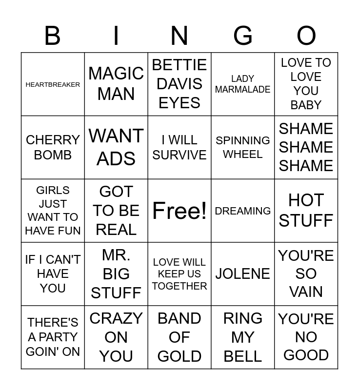 This bingo card has a free space and 49 words: GOLD DUST WOMAN, YOU'RE NO GOOD, KNOWING ME KNOWING YOU, BAND OF GOLD, MR. BIG STUFF, ME AND BOBBY MCGEE, MAGIC MAN, THE WILD ONE, CHERRY BOMB, BRAND NEW KEY, WANT ADS, LADY MARMALADE, YOU'RE SO VAIN, JOLENE, DELTA DAWN, MIDNIGHT TRAIN TO GEORGIA, I WILL SURVIVE, DREAMING, GYPSY'S TRAMPS & THEIVES, LOVE TO LOVE YOU BABY, GOT TO BE REAL, RING MY BELL, HEARTBREAKER, SPINNING WHEEL, WE ARE FAMILY, SHAME SHAME SHAME, THERE'S A PARTY GOIN' ON, RIGHT BACK WHERE WE STARTED FROM, LOVE WILL KEEP US TOGETHER, IF I CAN'T HAVE YOU, ROSE GARDEN, DON'T IT MAKE MY BROWN EYES BLUE, BARRACUDA, EDGE OF 17, CRAZY ON YOU, BECAUSE THE NIGHT, ONE WAY OR ANOTHER, YOU DRIVE ME WILD, HOT STUFF, CALL ME, BLUE BAYOU, GLORIA, LIKE A VIRGIN, WALK LIKE AN EGYPRIAN, GIRLS JUST WANT TO HAVE FUN, BETTIE DAVIS EYES, JUMP (FOR MY LOVE), HIT ME WITH YOUR BEST SHOT and HOLDING OUT FOR A HERO.