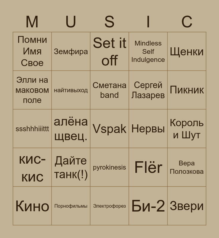 This bingo card has a free space and 24 words: Дайте танк(!), Порнофильмы, Сметана band, Кино, Щенки, Помни Имя Свое, Элли на маковом поле, Земфира, Нервы, pyrokinesis, Сергей Лазарев, ssshhhiiittt, Flër, Вера Полозкова, найтивыход, Би-2, Король и Шут, Set it off, Пикник, алёна щвец., Звери, кис-кис, Mindless Self Indulgence and Электрофорез.