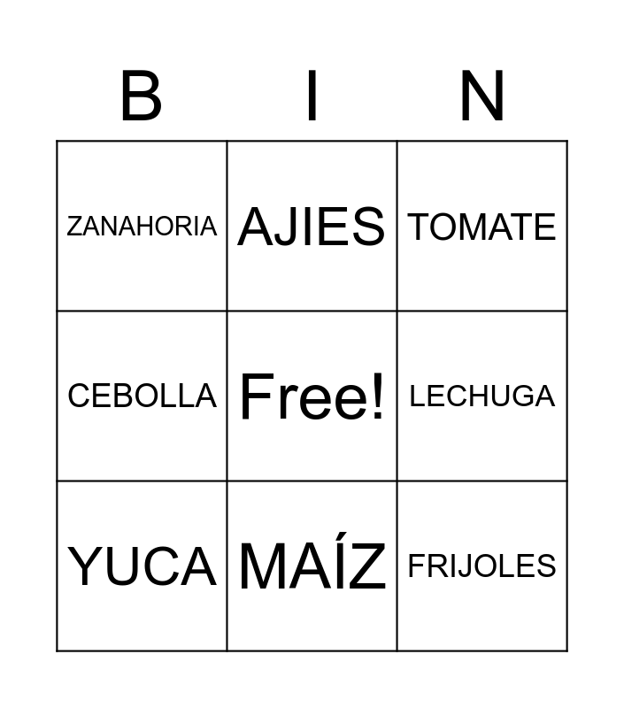 This bingo card has a free space and 12 words: PEPINO, REPOLLO, FRIJOLES, LECHUGA, AJIES, TOMATE, MAÍZ, REMOCLACHA, ZANAHORIA, CEBOLLA, YUCA and CULANTRO.