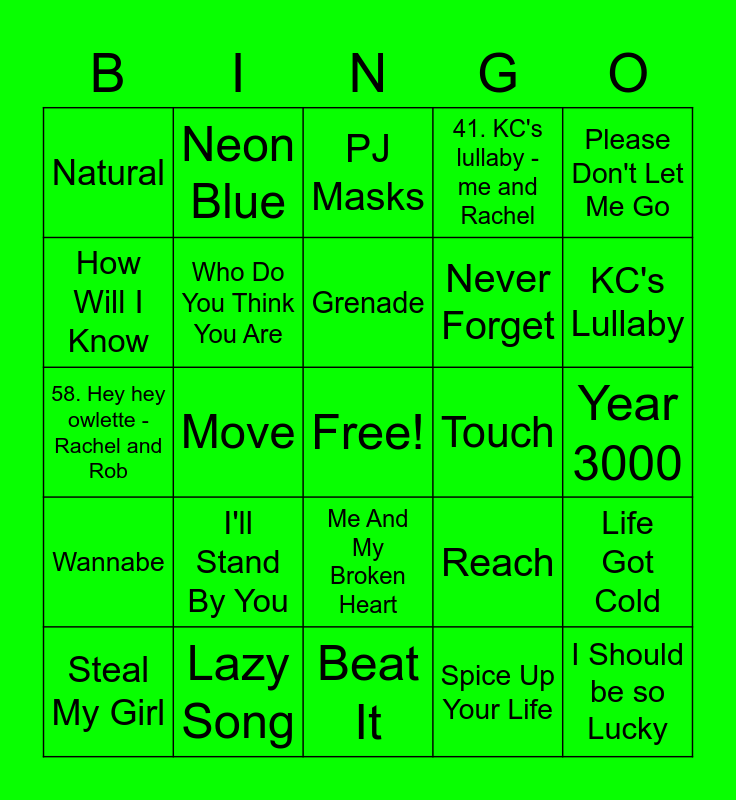 This bingo card has a free space and 401 words: Toxic, Stayin Alive, Night Is Young, Love at first sight, Please Don't Let Me Go, Nativity 3, Amazing Machines, I'm on the Case, Happy Now, Rule The World, I Wish It Could Be Xmas, Why Did It Have To Be Me, Smile Please, Think About Us, Fairytale, Story Of My Life, Secret Love Song, What I've Been Looking For, When All Is Said and Done, CITV, Slipping Through My Fingers, Knowing Me Knowing You, 51. Tap tap tap your feet - me and Beckie, Say You'll Be There, Nativity 2, More Than Friends, Promise This, Never Had A Dream Come True, Perfect, PJ Masks, Grace Kelly, Geno, If I Were A Boy, Lush Life, Fozzie, 48. Hello Christmas - me and Rachel, Rewrite The Stars, Newsround, Patience, Me And My Broken Heart, Greatest Day, Lazy Song, Wrecking Ball, We Can't Stop, Don't Stop Me Now, Piggy - Jo and me, Last Thing On My Mind, Family, 31. Never sky - Gio and Rob, One and One, Super Trouper, Story Of A Heart, So am I, 29. Upside-downsy Conga - Pete and Hannah, 3. Training - Rachel and Me, Muppet Babies, 15. Picture perfect - Phil and Louise, Live While Were Young, NHSA, Yoga, Summer Of Love, Voulez Vous, I've Been Waiting For You, Take A Chance On Me, Good Mood, Sparky Come Back to Me, Touch, Something New, YMCA, Who Do You Think You Are, 27. Bringing this baby home - Rachel and Brandon, 38. Make some noise - Grace and me, Loco Motion, Spinning Around, Number 1, Easier, 16. Mousekadoer - James and Me, Little Me, Black Magic, No More Tears Enough, Tell Me Ma, Someone You Loved, Feelings, Dancing Queen, KC's Lullaby, Angel Eyes, Sometimes, With Ur Love, Stop, Wannabe, 6. Get up and dance - Me and Richie, Two In A Million, 5678, Friends, The Voice, Heart Skips a Beat, 14. Minnie's boutique - me and Elaine, Ooh la la, Heroes, Strictly, Bring It All Back, 59. I'm Luna girl - me and Rachel, Year 3000, Here and Now, I Know him so well, Brave heart, Best Song Ever, Could It Be Magic, Start up your imagination, Burn, Cry Me A River, 4. Seasons - Rachel and Andy, Stay The Night, DNA, The Scientist, This Is Me, Puppy Love, My Love My Life, 17. Walking the plank - Andy and Rob, 8. Count on Us - Flo and Hannah, One For Sorrow, Out Of Our Heads, Footprints in the sand, Life of Riley, I Have A Dream, Unpredictable, I Think Were Alone Now, Cheap Thrills, Cannonball, Jump, The Chase, A Million Love Songs, Bop To The Top, Titanium, Beat Of My Drum, 20. Super moves - Thomas me and Rachel, Put Yourself In My Place, Summer, Love Ain't Gonna Wait for You, Stomp, X Factor, Senses, Venus, Airplanes, I Do I Do I Do I Do I Do, Spice Up Your Life, Night Changes, 40. Choo-choo boogie - Rob and James, What The Future Holds, The Loving Kind, Rock DJ, Shackles, Playtime, Can't Get You Out Of My Head, Long Hot Summer, Andante Andante, S Club Party, Midnight Memories, Wings, Heartbeat, 11. Everyday fun - Beckie and Me, 41. KC's lullaby - me and Rachel, Animals, Love Ain't Here Anymore, Run, Mamma Mia, Love Machine, Honey Honey, Don't Stop Believin, 56. I'm on the case - me and Rachel, Something Kinda Ooh, Cartoonito, Ruff Ruff Tweet and Dave, Wouldn't Change A Thing, St Trinians, Thank You For The Music, Gimme Gimme Gimme, Breaking Free, Tears, When Love Takes Over, Music, 36. Cedric the Great - rob and Paul, Power, The Promise, Untouchable, The Masked Singer, Fly On The Wings of Love, Summer's Lullaby, Dance With Me Tonight, 18. Princess things - me and Beckie, Glorious, 53. Hot hot lava - me and Gio, Roar, That's My Girl, 23. Anything - Rachel and me, CBBC, Let Me Entertain You, Scared of the Dark, Step Back In Time, I Begin to Wonder, You Are Not Alone, Move, See The Day, Pray, Kids, The Climb, Hero, Penguin with A Plan, Never have to say goodbye, Cest la Vie, Call Me, Eurovision, Hand On Your Heart, Gonzo - Gio and Jo, Disney Junior, Headlines, Tobogganing, Back For Good, 26. The hugglemonster way - Rachel and Rob, At Last, Don't Stop Movin, Heartbreak In This City, Hallelujah, I Turn to You, Biology, 50. Weather - me and Flo, Parachute, Goodbye, No More Sad Songs, Rehab, Kermit, Call The Shots, Tiger Feet, Better The Devil you Know, Man I Feel Like A woman, 33. Ready for action - me and Eve, 19. The spotlight - me and Rachel, 55. Chugga chugga - Grace and Rob, 30. Tots Theme - Rob me and Rachel, Can't Speak French, Scrambled, Kidz, Hair, Dynamite, Young Hearts Run Free, You Don't Know Love, History, I'll Stand By You, What Makes You Beautiful, Alive, 54. I've got pizzazz - me and Louise, Steal My Girl, Grenade, My Love My Life, Never Too Late, Sound Of The Underground, 46. I belong - me and Jo, Tears On My Pillow, Shout Out To My Ex, 44. Never land pirate band - Gio and Beckie, Shine, Nick Jr, Here It Comes Again, Back to Black, 52. Pirates Island hideout - Gio and Rachel, The Flood, Songs, Paw Patrol, Animal - me and Andy, Pretend, 37. Stuffy the Great - Hannah and me, Salute, Cha Cha Slide, UP, Waterloo, Could It Be Magic, CBeebies, Relight My Fire, No, 28. A bicycle built for two - James and Brandon, 21. Royal Fun - Flo and me, Too Much, Na Na Hey Hey Kiss Him Goodbye, Nativity, Neon Blue, 60. Take over the world - Paul and me, These Days, No Good Advice, 12. I've been there buddy - Rob and Rachel, 45. Mighty Little Gekko - Dave and Amy, Natural, Lay All Your Love On Me, Mama, Pack Up, 13. I can't cuddle - Andy and Flo, 24. PJ masks and feeling great - Pete and Andy, Like It, Chiquitita, Better Best Forgotten, The New Pup, Colours, 39. Letters - me and Andy, Fight For This Love, Always, 5. Beach night party - Pete and Rob, The Greatest Dancer, Call Me, 42. Start of your imagination - me and Rachel, Don't Leave Me This Way, Milkshake, Raining Sunshine, 2 Hearts, Love Me Like You, 2. Bubbly Blue - Gio and Andy, Ballet, Life Got Cold, 34. Perfect slumber party - Ben and me, 7. Hero - Me and Rachel, Wake Me Up, 58. Hey hey owlette - Rachel and Rob, Not Tonight Santa, Deeper Shade Of Blue, I Should be so Lucky, Dancing On Ice, Love Me Like You Do, You're My Number One, 22. Spine Chi