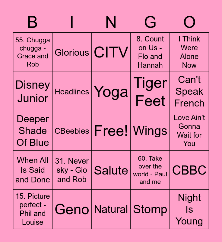 This bingo card has a free space and 401 words: One and One, 25. The summer dances - everyone, Rolling In The Deep, The New Pup, I Think Were Alone Now, Man I Feel Like A woman, 37. Stuffy the Great - Hannah and me, St Trinians, The Masked Singer, Summer's Lullaby, Heartbreak In This City, Fly On The Wings of Love, Fozzie - Me and Thomas, 39. Letters - me and Andy, Pack Up, 50. Weather - me and Flo, Chain Reaction, Who Do You Think You Are, Loco Motion, Stay The Night, 2 Become 1, Lazy Song, 57. Everybody's good at something - Rob Paul and me, Grenade, History, Super Trouper, Raining Sunshine, Just Give Me A Reason, I Know him so well, CITV, Tragedy, 11. Everyday fun - Beckie and Me, Hair, Music, 44. Never land pirate band - Gio and Beckie, Never Too Late, 13. I can't cuddle - Andy and Flo, Chiquitita, Cheap Thrills, Salute, Not Tonight Santa, Geno, 2. Bubbly Blue - Gio and Andy, Call Me, This Is Me, Kidz, Can't Get You Out Of My Head, Too Much, Dance With Me Tonight, Let Me Entertain You, Nick Jr, Lush Life, Jump Jump Star, Perfect, No More Tears Enough, 45. Mighty Little Gekko - Dave and Amy, Hallelujah, Start up your imagination, Night Changes, What Makes You Beautiful, Could It Be Magic, Put Yourself In My Place, One For Sorrow, Knowing Me Knowing You, Never Forget, Live While Were Young, Wings, Better Best Forgotten, The Winner Takes It All, Headlines, Nativity 3, Easier, Hand On Your Heart, The Chase, Shake Your Body, Tears On My Pillow, Don't Stop Believin, 41. KC's lullaby - me and Rachel, 24. PJ masks and feeling great - Pete and Andy, The Flood, Rewrite The Stars, Parachute, Jump, I Should be so Lucky, Can't Speak French, Tears, Nativity 2, 18. Princess things - me and Beckie, If I Were A Boy, When All Is Said and Done, YMCA, Amazing Machines, Our Last Summer, Call The Shots, DNA, Na Na Hey Hey Kiss Him Goodbye, Long Hot Summer, At Last, Hero, Newsround, So What, SOS, Love Ain't Gonna Wait for You, Never Had A Dream Come True, Unpredictable, That's My Girl, Steal My Girl, Sparky Come Back to Me, Shackles, I'm on the Case, Back For Good, Breaking Free, Anymore, 23. Anything - Rachel and me, Rock DJ, 53. Hot hot lava - me and Gio, Friends, Dancing Queen, Gonzo - Gio and Jo, Fairytale, I Begin to Wonder, 12. I've been there buddy - Rob and Rachel, Wouldn't Change A Thing, Sweet Child O Mine, Unpredictable, Happy Now, 32 . Kermit - me and Pete, Touch, Call Me, 19. The spotlight - me and Rachel, The Promise, 4. Seasons - Rachel and Andy, 54. I've got pizzazz - me and Louise, Thank You For The Music, Best Song Ever, Reggaeton Lento, Love at first sight, Summer Of Love, Something New, Power, Could It Be Magic, Run, Voulez Vous, 34. Perfect slumber party - Ben and me, Bop To The Top, Stomp, Sometimes, One Way or Another (Teenage Kicks), Angel Eyes, Promise This, Beat It, I Do I Do I Do I Do I Do, 51. Tap tap tap your feet - me and Beckie, 36. Cedric the Great - rob and Paul, 3. Training - Rachel and Me, Ballet, I've Been Waiting For You, 7. Hero - Me and Rachel, Love Me Like You Do, Playtime, Bring It All Back, 8. Count on Us - Flo and Hannah, Animal - me and Andy, Reach, Beat Of My Drum, Make Your Own Kind Of Music, Does Your Mother Know, What Makes You Beautiful, Tobogganing, 14. Minnie's boutique - me and Elaine, Step Back In Time, 29. Upside-downsy Conga - Pete and Hannah, Name Of The Game, Good Mood, The Climb, Dear Darlin, Piggy - Jo and me, 27. Bringing this baby home - Rachel and Brandon, Honey Honey, I'm A Celebrity, Titanium, Somebody Else's Guy, Like It, 56. I'm on the case - me and Rachel, Cry Me A River, 9. Super singing Heroes - Rachel and David, See The Day, Let Me Down, I Have A Dream, Young Hearts Run Free, No, Wrecking Ball, Lucky Day, So am I, Penguin with A Plan, Say You'll Be Mine, Burn, Lost In Music, Cha Cha Slide, A Moment Like This, Wake Me Up, CBeebies, Drag Me Down, Steady and Slow, Gonzo, What The Future Holds, We Can't Stop, The Scientist, Hi-5, Roar, Spice Up Your Life, Story Of A Heart, Love Ain't Here Anymore, 43. Disney junior song - everyone, Milkshake, Slipping Through My Fingers, Fozzie, 6. Get up and dance - Me and Richie, You Are Not Alone, Lay All Your Love On Me, 16. Mousekadoer - James and Me, I Believe in You, Heartbeat, I Wish It Could Be Xmas, Money Money Money, Toxic, 5678, No More Sad Songs, Little Me, 30. Tots Theme - Rob me and Rachel, You Know I'm No Good, Do They Know It's Christmas, Somewhere Only We Know, Last Thing On My Mind, Brave heart, The Show, Scared of the Dark, Family, My Love My Life, I'm Still Standing, Love Machine, These Days, 17. Walking the plank - Andy and Rob, 28. A bicycle built for two - James and Brandon, Someone You Loved, 2 Hearts, Number 1, 31. Never sky - Gio and Rob, 48. Hello Christmas - me and Rachel, Footprints in the sand, Puppy Love, 15. Picture perfect - Phil and Louise, Yoga, 35. The clubhouse birthday party - James and Melissa, 10. Picture You - Flo and Me, The Voice, Slipping Through My Fingers, Don't Stop Me Now, Scrambled, PJ Masks, Me And My Broken Heart, Heart Skips a Beat, Stomps, Cartoonito, Gimme Gimme Gimme, Grace Kelly, Oops I Did It Again, Paw Patrol, Cannonball, 38. Make some noise - Grace and me, Midnight Memories, 26. The hugglemonster way - Rachel and Rob, 33. Ready for action - me and Eve, I Turn to You, Never have to say goodbye, S Club Party, Wannabe, Waterloo, You're My Number One, Out Of Our Heads, Pray, Lipstick, Secret Love Song, NHSA, Glorious, Don't Stop Movin, 58. Hey hey owlette - Rachel and Rob, Better The Devil you Know, 21. Royal Fun - Flo and me, When Love Takes Over, 55. Chugga chugga - Grace and Rob, Don't Leave Me This Way, What I've Been Looking For, More Than Friends, Strictly, All About The Bass, 47. Summer square dance - Rob me Rachel and Paul, Love Me Like You, When I Kissed The Teacher, Andante Andante, Stayin Alive, Amarillo, Greatest Day, KC's Lullaby, Stop, Think About Us, Ooh la la, Flames, Alive, Why Did It Have To Be Me, Mama, Goodbye, How Will I Know, 22. S