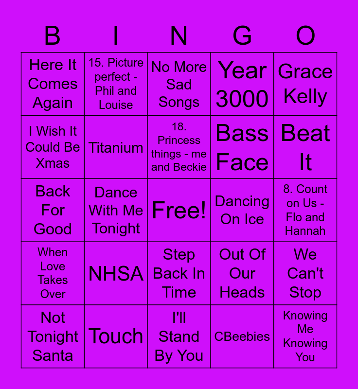 This bingo card has a free space and 401 words: Toxic, Like It, X Factor, Amarillo, Grace Kelly, That's My Girl, The Winner Takes It All, Shout Out To My Ex, Perfect, Songs, Scrambled, Loco Motion, Hallelujah, Who Do You Think You Are, 5. Beach night party - Pete and Rob, Hi-5, Sweet Child O Mine, Airplanes, Young Hearts Run Free, Let Me Down, I Do I Do I Do I Do I Do, One and One, Geno, Live While Were Young, History, Slipping Through My Fingers, Nothing Scares Me, 9. Super singing Heroes - Rachel and David, Heartbeat, No More Sad Songs, Best Song Ever, Nativity 2, YMCA, You Know I'm No Good, Fight For This Love, Steady and Slow, Greatest Day, Kids, So am I, Step Back In Time, Cry Me A River, Touch, Better The Devil you Know, Scared of the Dark, 31. Never sky - Gio and Rob, Smile Please, At Last, 4. Seasons - Rachel and Andy, Tiger Feet, When You're Gone, 35. The clubhouse birthday party - James and Melissa, Make Your Own Kind Of Music, Rolling In The Deep, Steal My Girl, Lipstick, Senses, PJ Masks, Take A Chance On Me, Wannabe, Disney Junior, 48. Hello Christmas - me and Rachel, Yoga, Cest la Vie, Oops I Did It Again, Newsround, 29. Upside-downsy Conga - Pete and Hannah, Dancing On Ice, If I Were A Boy, Hair, Titanium, Summer's Lullaby, Venus, How Will I Know, Cha Cha Slide, 41. KC's lullaby - me and Rachel, Say You'll Be There, Piggy - Jo and me, Love at first sight, Night Changes, Amazing Machines, Ruff Ruff Tweet and Dave, Let Me Entertain You, 17, Fozzie, Beat It, No More Tears Enough, More Than Friends, Lucky Day, Something Kinda Ooh, When Love Takes Over, Shake Your Body, 28. A bicycle built for two - James and Brandon, 45. Mighty Little Gekko - Dave and Amy, Waterline, Spice Up Your Life, 52. Pirates Island hideout - Gio and Rachel, Footprints in the sand, Feelings, 2. Bubbly Blue - Gio and Andy, Nativity, The Loving Kind, What The Future Holds, 8. Count on Us - Flo and Hannah, Jump, Heart Skips a Beat, My Love My Life, Call Me, 47. Summer square dance - Rob me Rachel and Paul, Life Got Cold, Rule The World, 21. Royal Fun - Flo and me, 16. Mousekadoer - James and Me, Love Ain't Here Anymore, With Ur Love, Cheap Thrills, Ooh la la, 49. I don't know what I've been told - me Rachel Rob and Flo, Why Did It Have To Be Me, Just Give Me A Reason, 60. Take over the world - Paul and me, Love Machine, Breaking Free, 7. Hero - Me and Rachel, Heroes, 43. Disney junior song - everyone, Rewrite The Stars, Tragedy, 22. Spine Chiller - Ben and Rob, Pray, Especially For You, 25. The summer dances - everyone, 14. Minnie's boutique - me and Elaine, This Is Me, Grenade, Dear Darlin, Money Money Money, Too Much, Don't Stop Me Now, Colours, The Flood, When All Is Said and Done, 1. Hot Dog - James and Melissa, Don't Stop Believin, Nativity 3, Biology, CBeebies, 26. The hugglemonster way - Rachel and Rob, Glorious, Night Is Young, Headlines, Me And My Broken Heart, I'm A Celebrity, 51. Tap tap tap your feet - me and Beckie, Move, Gonzo, Deeper Shade Of Blue, Bop To The Top, Viva Forever, No, Tobogganing, 12. I've been there buddy - Rob and Rachel, Year 3000, 6. Get up and dance - Me and Richie, Sound Of The Underground, 19. The spotlight - me and Rachel, Cannonball, You're My Number One, What Makes You Beautiful, Happy Now, Pack Up, Can't Speak French, Somebody Else's Guy, Gonzo - Gio and Jo, Say You'll Be Mine, 38. Make some noise - Grace and me, You Don't Know Love, A Million Love Songs, 11. Everyday fun - Beckie and Me, 2 Become 1, So What, I've Been Waiting For You, Slipping Through My Fingers, Music, 54. I've got pizzazz - me and Louise, Heartbreak In This City, Never Too Late, Cartoonito, 23. Anything - Rachel and me, Shackles, Parachute, Man I Feel Like A woman, You Are Not Alone, DNA, Milkshake, Strictly, Patience, Sometimes, Playtime, Untouchable, Somewhere Only We Know, Name Of The Game, Dance With Me Tonight, 42. Start of your imagination - me and Rachel, 5678, Flames, 20. Super moves - Thomas me and Rachel, CITV, Ballet, Life of Riley, Lay All Your Love On Me, Mama, CBBC, Easier, Lush Life, Don't Leave Me This Way, Could It Be Magic, The Climb, Andante Andante, Little Me, Kermit, The Scientist, Long Hot Summer, S Club Party, Thank You For The Music, 2 Hearts, Burn, The Chase, I'm Still Standing, Love Ain't Gonna Wait for You, Call Me, 50. Weather - me and Flo, The Greatest Dancer, Back to Black, Power, Please Don't Let Me Go, No Good Advice, All About The Bass, 56. I'm on the case - me and Rachel, The Voice, Unpredictable, Muppet Babies, Secret Love Song, Animals, Think About Us, Wouldn't Change A Thing, Tell Me Ma, Black Magic, NHSA, Always, Gimme Gimme Gimme, Never have to say goodbye, Not Tonight Santa, 18. Princess things - me and Beckie, 40. Choo-choo boogie - Rob and James, Reggaeton Lento, Paw Patrol, Beat Of My Drum, I Believe in You, Chain Reaction, Stay The Night, Family, Shine, Do They Know It's Christmas, Voulez Vous, 3. Training - Rachel and Me, 46. I belong - me and Jo, I Should be so Lucky, My Love My Life, 13. I can't cuddle - Andy and Flo, See The Day, 58. Hey hey owlette - Rachel and Rob, Puppy Love, Call The Shots, Reach, Sparky Come Back to Me, What I've Been Looking For, Something New, Angel Eyes, Is It True, Run, The Show, I Have A Dream, Alive, Waterloo, 15. Picture perfect - Phil and Louise, Wake Me Up, I Turn to You, Stop, I'm on the Case, 17. Walking the plank - Andy and Rob, Here It Comes Again, Neon Blue, Dancing Queen, Salute, Relight My Fire, Don't Stop Movin, Could It Be Magic, Fly On The Wings of Love, Fairytale, Two In A Million, Hand On Your Heart, Chiquitita, These Days, Our Last Summer, UP, Wings, Number 1, I Think Were Alone Now, Unpredictable, 59. I'm Luna girl - me and Rachel, Midnight Memories, 32 . Kermit - me and Pete, Pretend, Tears On My Pillow, Anymore, We Can't Stop, Animal - me and Andy, 30. Tots Theme - Rob me and Rachel, Summer - me and Rachel, Back For Good, Stomp, I Know him so well, Knowing Me Knowing You, Raining Sunshine, Promise This, G