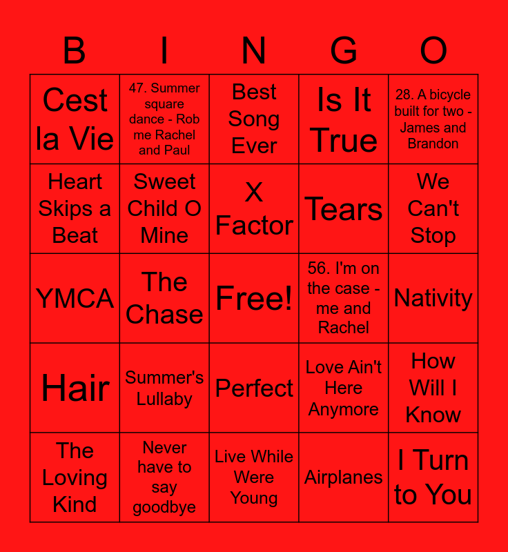 This bingo card has a free space and 401 words: Thank You For The Music, Fozzie, Stop, Story Of A Heart, 28. A bicycle built for two - James and Brandon, 19. The spotlight - me and Rachel, Wings, 14. Minnie's boutique - me and Elaine, Loco Motion, Muppet Babies, Sometimes, Tears On My Pillow, Cannonball, My Love My Life, So What, Music, No More Sad Songs, Don't Leave Me This Way, Stomp, Don't Stop Me Now, Salute, Name Of The Game, 2 Become 1, Black Magic, I've Been Waiting For You, When Love Takes Over, 2. Bubbly Blue - Gio and Andy, Here and Now, Story Of My Life, Best Song Ever, Anymore, Sound Of The Underground, SOS, 58. Hey hey owlette - Rachel and Rob, Why Did It Have To Be Me, 37. Stuffy the Great - Hannah and me, Penguin with A Plan, Kidz, Reggaeton Lento, Perfect, Rule The World, Never have to say goodbye, Can't Get You Out Of My Head, 7. Hero - Me and Rachel, Lush Life, Life Got Cold, I Know him so well, Nativity 3, 33. Ready for action - me and Eve, No Good Advice, PJ Masks, Gimme Gimme Gimme, UP, Love Machine, I'm on the Case, What I've Been Looking For, 42. Start of your imagination - me and Rachel, Colours, Set Fire To The Rain, Waterloo, Bring It All Back, Lost In Music, Drag Me Down, Beat Of My Drum, Hallelujah, Man I Feel Like A woman, 56. I'm on the case - me and Rachel, Stomps, Pretend, Sweet Child O Mine, 17, Shout Out To My Ex, Me And My Broken Heart, 51. Tap tap tap your feet - me and Beckie, Tiger Feet, Does Your Mother Know, Wouldn't Change A Thing, The Greatest Dancer, Ruff Ruff Tweet and Dave, Bop To The Top, One Way or Another (Teenage Kicks), 40. Choo-choo boogie - Rob and James, Heartbeat, I'm A Celebrity, We Can't Stop, 13. I can't cuddle - Andy and Flo, Wrecking Ball, I Wish It Could Be Xmas, 5. Beach night party - Pete and Rob, Hair, Footprints in the sand, 57. Everybody's good at something - Rob Paul and me, Call The Shots, 41. KC's lullaby - me and Rachel, Yoga, Super Trouper, Animal - me and Andy, 6. Get up and dance - Me and Richie, Andante Andante, Who Do You Think You Are, 27. Bringing this baby home - Rachel and Brandon, Promise This, Nativity, Spinning Around, Rolling In The Deep, Newsround, Smile Please, Brave heart, I Think Were Alone Now, Better The Devil you Know, Put Yourself In My Place, Animals, Love at first sight, What The Future Holds, No More Tears Enough, Flames, One and One, 39. Letters - me and Andy, 31. Never sky - Gio and Rob, Summer - me and Rachel, 32 . Kermit - me and Pete, Last Thing On My Mind, Move, Toxic, Call Me, Oops I Did It Again, Dance With Me Tonight, Tragedy, The Scientist, The Flood, One For Sorrow, All About The Bass, Never Had A Dream Come True, Shackles, Grace Kelly, Never Forget, Unpredictable, You Don't Know Love, 52. Pirates Island hideout - Gio and Rachel, Stay The Night, 24. PJ masks and feeling great - Pete and Andy, This Is Me, I Believe in You, 49. I don't know what I've been told - me Rachel Rob and Flo, Back to Black, Airplanes, Steady and Slow, Summer, Someone You Loved, Our Last Summer, Euphoria, 36. Cedric the Great - rob and Paul, 8. Count on Us - Flo and Hannah, That's My Girl, 23. Anything - Rachel and me, Call Me, 34. Perfect slumber party - Ben and me, Let Me Down, 2 Hearts, Honey Honey, Glorious, Is It True, The Promise, Easier, Heroes, 1. Hot Dog - James and Melissa, You Know I'm No Good, Let Me Entertain You, Hand On Your Heart, 21. Royal Fun - Flo and me, Not Tonight Santa, The Climb, The Masked Singer, A Moment Like This, 26. The hugglemonster way - Rachel and Rob, When I Kissed The Teacher, So am I, Amazing Machines, Fairytale, Back For Good, Gonzo, Sparky Come Back to Me, What Makes You Beautiful, NHSA, Greatest Day, Take A Chance On Me, Viva Forever, Friends, S Club Party, 15. Picture perfect - Phil and Louise, Wake Me Up, Shine, Good Mood, Happy Now, Lucky Day, Out Of Our Heads, Playtime, Mama, Especially For You, Little Me, No, The Chase, Year 3000, The Voice, Don't Stop Believin, These Days, Never Too Late, Spice Up Your Life, Say You'll Be Mine, Could It Be Magic, Steal My Girl, Steady and Slow, Untouchable, 44. Never land pirate band - Gio and Beckie, Can't Speak French, Goodbye, Love Me Like You, Money Money Money, Raining Sunshine, Breaking Free, Somewhere Only We Know, Rock DJ, Burn, Dear Darlin, Angel Eyes, CBBC, Patience, Scared of the Dark, Love Ain't Gonna Wait for You, 48. Hello Christmas - me and Rachel, Beat It, 35. The clubhouse birthday party - James and Melissa, What Makes You Beautiful, 54. I've got pizzazz - me and Louise, Grenade, Natural, Parachute, Jump Jump Star, History, Long Hot Summer, Waterline, Nativity 2, Ooh la la, I Do I Do I Do I Do I Do, 60. Take over the world - Paul and me, I Begin to Wonder, Pack Up, Summer's Lullaby, Number 1, Too Much, See The Day, The Loving Kind, X Factor, Chiquitita, Cartoonito, Cha Cha Slide, Amarillo, Mamma Mia, 46. I belong - me and Jo, Summer Of Love, 38. Make some noise - Grace and me, 5678, Rehab, More Than Friends, 20. Super moves - Thomas me and Rachel, Feelings, 55. Chugga chugga - Grace and Rob, Wannabe, The Winner Takes It All, Alive, Nothing Scares Me, Secret Love Song, Dynamite, Cry Me A River, Pray, When You're Gone, Paw Patrol, The New Pup, 50. Weather - me and Flo, Better Best Forgotten, 29. Upside-downsy Conga - Pete and Hannah, Fozzie - Me and Thomas, Just Give Me A Reason, Tell Me Ma, 47. Summer square dance - Rob me Rachel and Paul, Slipping Through My Fingers, Tobogganing, Two In A Million, I'm Still Standing, 12. I've been there buddy - Rob and Rachel, Cest la Vie, Kids, 17. Walking the plank - Andy and Rob, Jump, Family, I Have A Dream, Geno, With Ur Love, Lay All Your Love On Me, Reach, Something Kinda Ooh, A Million Love Songs, Hero, Ballet, Dancing On Ice, Fly On The Wings of Love, Unpredictable, Like It, Titanium, Puppy Love, Night Changes, Step Back In Time, Piggy - Jo and me, 16. Mousekadoer - James and Me, Slipping Through My Fingers, How Will I Know, Shake Your Body, 11. Everyday fun - Beckie and Me, S