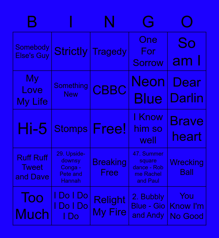 This bingo card has a free space and 401 words: At Last, One Way or Another (Teenage Kicks), Start up your imagination, What The Future Holds, So am I, Jump, A Moment Like This, Pack Up, Tiger Feet, Summer's Lullaby, I Turn to You, 48. Hello Christmas - me and Rachel, Scared of the Dark, Hero, 17. Walking the plank - Andy and Rob, Secret Love Song, Story Of A Heart, Sometimes, Lush Life, The Chase, SOS, Just Give Me A Reason, Is It True, The Climb, Wings, Midnight Memories, Playtime, The Flood, Let Me Entertain You, Tragedy, A Million Love Songs, Does Your Mother Know, Grenade, Newsround, All About The Bass, Here and Now, Stayin Alive, Sound Of The Underground, UP, Breaking Free, Fozzie, I Do I Do I Do I Do I Do, Reach, DNA, Dynamite, 44. Never land pirate band - Gio and Beckie, Could It Be Magic, Andante Andante, Fight For This Love, Never Had A Dream Come True, Stay The Night, Number 1, Never Forget, Sweet Child O Mine, Run, Power, No Good Advice, 8. Count on Us - Flo and Hannah, 13. I can't cuddle - Andy and Flo, Senses, Call The Shots, Shake Your Body, Reggaeton Lento, I Believe in You, What Makes You Beautiful, Paw Patrol, I Know him so well, Flames, When I Kissed The Teacher, Something New, Beat It, Alive, Slipping Through My Fingers, Music, Put Yourself In My Place, Euphoria, NHSA, Kidz, PJ Masks, Love Me Like You Do, The Loving Kind, Penguin with A Plan, Nativity 3, Night Changes, Dear Darlin, Thank You For The Music, Touch, When Love Takes Over, Here It Comes Again, Ruff Ruff Tweet and Dave, Lay All Your Love On Me, Rehab, Geno, Cartoonito, 25. The summer dances - everyone, Black Magic, 26. The hugglemonster way - Rachel and Rob, The Winner Takes It All, 34. Perfect slumber party - Ben and me, 1. Hot Dog - James and Melissa, Super Trouper, 37. Stuffy the Great - Hannah and me, Brave heart, Always, 15. Picture perfect - Phil and Louise, Name Of The Game, Perfect, Amarillo, History, Better Best Forgotten, Happy Now, 19. The spotlight - me and Rachel, Best Song Ever, Knowing Me Knowing You, I Begin to Wonder, Don't Stop Me Now, 14. Minnie's boutique - me and Elaine, Titanium, 52. Pirates Island hideout - Gio and Rachel, Colours, Loco Motion, 23. Anything - Rachel and me, Mama, 51. Tap tap tap your feet - me and Beckie, Love Ain't Gonna Wait for You, Unpredictable, 22. Spine Chiller - Ben and Rob, Love at first sight, No, Gonzo, Feelings, Nativity, The Promise, Take A Chance On Me, Toxic, 11. Everyday fun - Beckie and Me, CITV, 21. Royal Fun - Flo and me, The Show, 27. Bringing this baby home - Rachel and Brandon, Cannonball, Call Me, When All Is Said and Done, Eurovision, 49. I don't know what I've been told - me Rachel Rob and Flo, 2. Bubbly Blue - Gio and Andy, 6. Get up and dance - Me and Richie, Bring It All Back, Me And My Broken Heart, Nativity 2, 55. Chugga chugga - Grace and Rob, Something Kinda Ooh, Pretend, Grace Kelly, Animal - me and Andy, Don't Stop Believin, Two In A Million, 41. KC's lullaby - me and Rachel, Especially For You, Sparky Come Back to Me, Like It, One For Sorrow, Beat Of My Drum, Goodbye, No More Tears Enough, I'll Stand By You, Viva Forever, Don't Leave Me This Way, Dancing On Ice, Summer, Kids, Shine, Lipstick, Cheap Thrills, Heartbeat, 39. Letters - me and Andy, 7. Hero - Me and Rachel, Steady and Slow, Easier, X Factor, Better The Devil you Know, 42. Start of your imagination - me and Rachel, Could It Be Magic, That's My Girl, Waterloo, Animals, Kermit, 5678, 9. Super singing Heroes - Rachel and David, Out Of Our Heads, 58. Hey hey owlette - Rachel and Rob, Smile Please, Let Me Down, Ballet, 10. Picture You - Flo and Me, What I've Been Looking For, Tobogganing, Slipping Through My Fingers, I Should be so Lucky, Stop, Untouchable, Stomps, Disney Junior, Jump Jump Star, Love Ain't Here Anymore, 60. Take over the world - Paul and me, Drag Me Down, The Masked Singer, Someone You Loved, Heroes, Deeper Shade Of Blue, Call Me, Spinning Around, Why Did It Have To Be Me, KC's Lullaby, Hair, Burn, 20. Super moves - Thomas me and Rachel, Cest la Vie, Natural, Shackles, Biology, 2 Become 1, Long Hot Summer, Yoga, Bop To The Top, Not Tonight Santa, Lucky Day, St Trinians, These Days, Steal My Girl, 4. Seasons - Rachel and Andy, Hallelujah, How Will I Know, 54. I've got pizzazz - me and Louise, Unpredictable, Nick Jr, Rock DJ, Heart Skips a Beat, CBeebies, Salute, The New Pup, Raining Sunshine, Summer - me and Rachel, Heartbreak In This City, 30. Tots Theme - Rob me and Rachel, Lazy Song, 29. Upside-downsy Conga - Pete and Hannah, Cha Cha Slide, Last Thing On My Mind, Life Got Cold, Too Much, CBBC, Songs, If I Were A Boy, With Ur Love, 16. Mousekadoer - James and Me, 59. I'm Luna girl - me and Rachel, Anymore, Tell Me Ma, Wannabe, 3. Training - Rachel and Me, Live While Were Young, I've Been Waiting For You, Lost In Music, Somewhere Only We Know, S Club Party, Mamma Mia, Make Your Own Kind Of Music, 43. Disney junior song - everyone, 46. I belong - me and Jo, Think About Us, Piggy - Jo and me, Honey Honey, 28. A bicycle built for two - James and Brandon, Steady and Slow, Venus, This Is Me, My Love My Life, Bass Face, Glorious, Say You'll Be Mine, 40. Choo-choo boogie - Rob and James, Dancing Queen, Strictly, Shout Out To My Ex, Little Me, The Scientist, Summer Of Love, 17, Somebody Else's Guy, The Greatest Dancer, Rolling In The Deep, 53. Hot hot lava - me and Gio, 56. I'm on the case - me and Rachel, Don't Stop Movin, Headlines, Hand On Your Heart, Move, Man I Feel Like A woman, Ooh la la, Say You'll Be There, Young Hearts Run Free, Year 3000, Roar, Muppet Babies, Money Money Money, So What, Tears, 2 Hearts, Story Of My Life, I'm Still Standing, Life of Riley, See The Day, Voulez Vous, Wrecking Ball, Tears On My Pillow, Scrambled, 5. Beach night party - Pete and Rob, Hi-5, Back to Black, Step Back In Time, You Know I'm No Good, Amazing Machines, Fairytale, Nothing Scares Me, Footprints in the sand, 32 . Kermit - me and Pete, Never have to say goodbye, Can't Speak