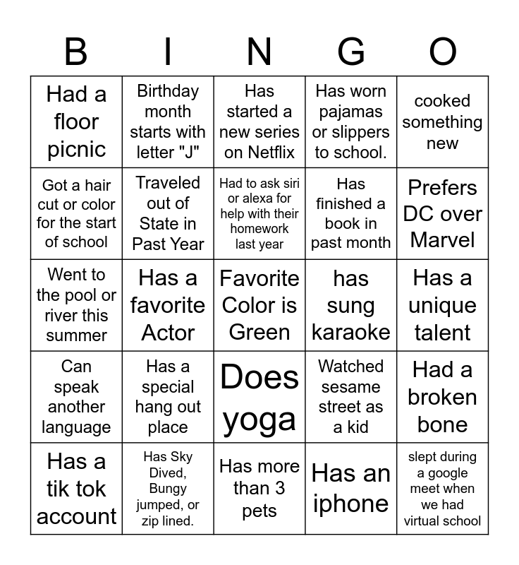This bingo card has 59 words: Has Brown Hair, Has Sky Dived, Bungy jumped, or zip lined., Has a favorite ice cream topping, Can speak another language, Has an iphone, Has run a race or triathlon, Traveled out of State in Past Year, Has a healthy habit, Has finished a book in past month, Has a favorite Disney Movie, Has worn pajamas or slippers to school., Has a Tattoo, Got a hair cut or color for the start of school, Plays or has played an Instrument, Has favourite activity with their kids/family, Had a floor picnic, Favorite Color is Green, cooked something new, Has a special dance move, Had to ask siri or alexa for help with their homework last year, has sung karaoke, Has started a new series on Netflix, Has a tik tok account, Had a broken bone, Got a new pet over the summer, Has gone camping, Wants to serve in the armed forces, Has Blue Eyes, Prefers DC over Marvel, Has traveled outside of the United States, Has a family pet, Has an annual family vacation, Has a favorite meal/food to cook, Can wink both eyes, Birthday month starts with letter "J", Has a favorite song to sing, Has two or more siblings, Has a favorite Actor, Has a favorite Actress, Went to the pool or river this summer, Has a favorite flower/plant, Has a special hang out place, Has a unique talent, Has a favorite stuffed animal, Has a hobby, Downloaded New App in Past Month, Has a family member overseas, Has an allergy, Does yoga, Has more than 3 pets, Has an unusual pet, Lives on more than 3 acres, Has been on a cruise, Born in the same month as you, Participates in a school activity (club, sport, theater, band,..etc.), Watched sesame street as a kid, Can name all 7 dwarfs (from Snow White), slept during a google meet when we had virtual school and Has Painted Nails.