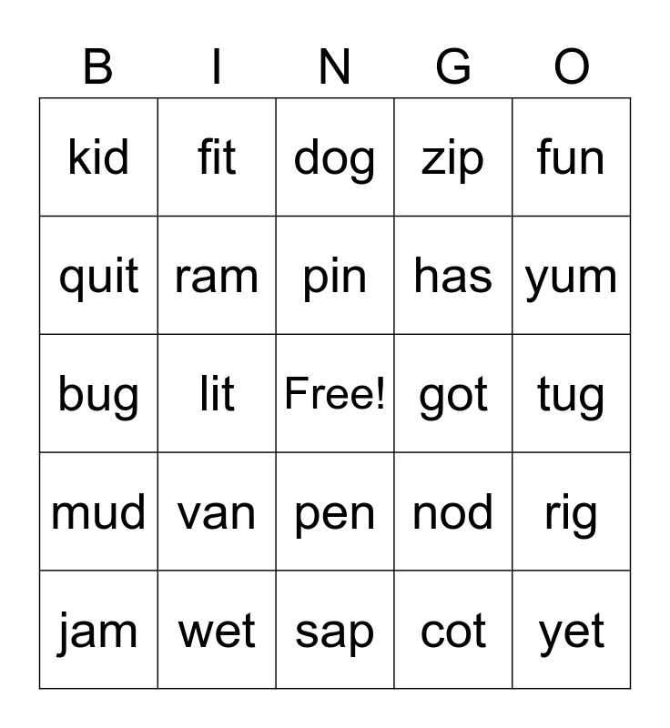 This bingo card has a free space and 24 words: van, wet, pin, jam, fun, kid, quit, fit, got, pen, has, bug, nod, rig, ram, cot, tug, dog, yum, lit, yet, mud, zip and sap.