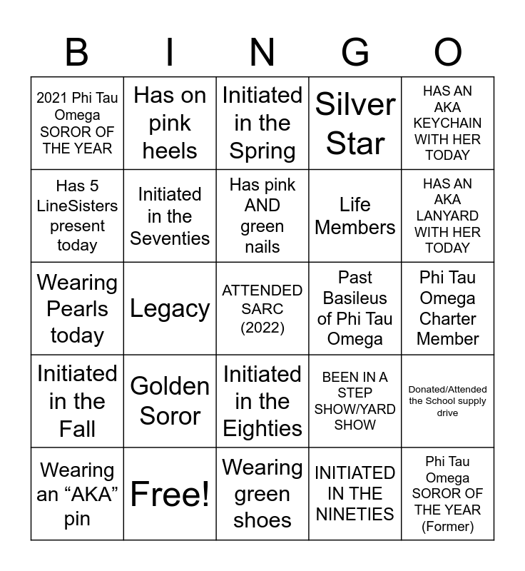 This bingo card has 30 words: Free!, Met Madam Supreme, Legacy, Ivy Box Subscription, 2021 Phi Tau Omega SOROR OF THE YEAR, Initiated in the Spring, Initiated in the Seventies, Initiated in the Eighties, Past Basileus of Phi Tau Omega, Wearing green shoes, Phi Tau Omega Charter Member, ATTENDED SARC (2022), INITIATED IN THE NINETIES, Phi Tau Omega SOROR OF THE YEAR (Former), HAS AN AKA LANYARD WITH HER TODAY, Attended Boule in Orlando (2022), BEEN IN A STEP SHOW/YARD SHOW, Initiated in the Fall, Golden Soror, HAS AN AKA KEYCHAIN WITH HER TODAY, Wearing Pearls today, JOINED THE BEST SORORITY, Has on pink heels, Life Members, Has 5 LineSisters present today, Silver Star, Donated/Attended the School supply drive, Wearing an “AKA” pin, Has pink AND green nails and Current Committee Chairman.