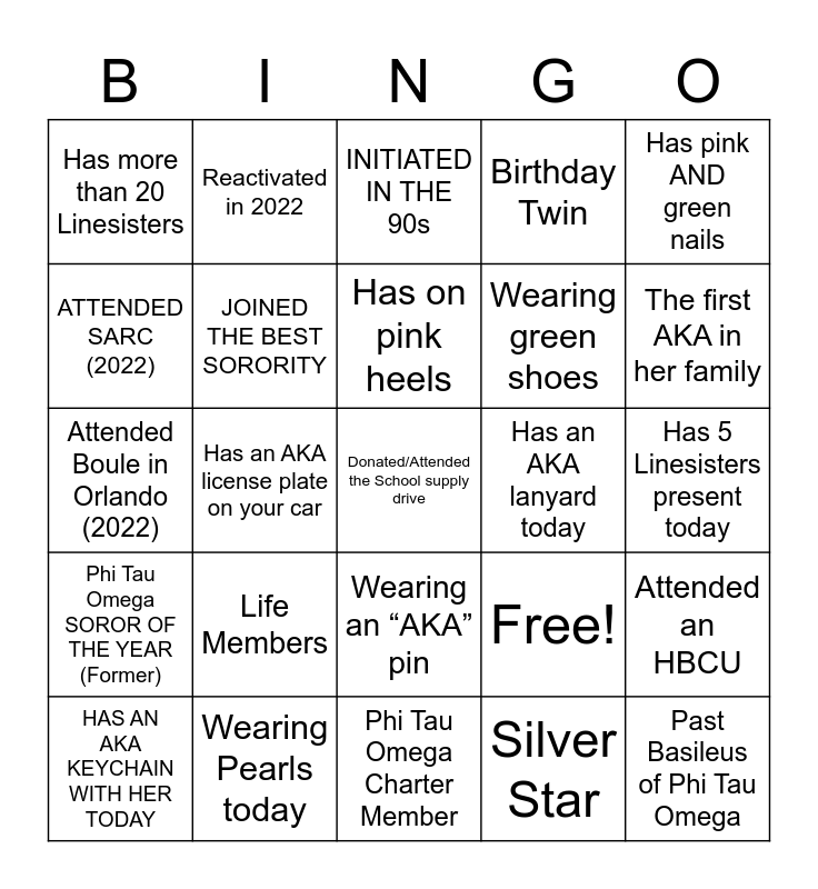 This bingo card has 27 words: Free!, Past Basileus of Phi Tau Omega, Wearing green shoes, Phi Tau Omega Charter Member, ATTENDED SARC (2022), INITIATED IN THE 90s, Reactivated in 2022, Phi Tau Omega SOROR OF THE YEAR (Former), Has an AKA lanyard today, Attended an HBCU, Attended Boule in Orlando (2022), Birthday Twin, HAS AN AKA KEYCHAIN WITH HER TODAY, Wearing Pearls today, The first AKA in her family, Has more than one legacy, JOINED THE BEST SORORITY, Has on pink heels, Life Members, Has more than 20 Linesisters, Has 5 Linesisters present today, Silver Star, Has an AKA license plate on your car, Donated/Attended the School supply drive, Wearing an “AKA” pin, Has pink AND green nails and Current Committee Chairman.