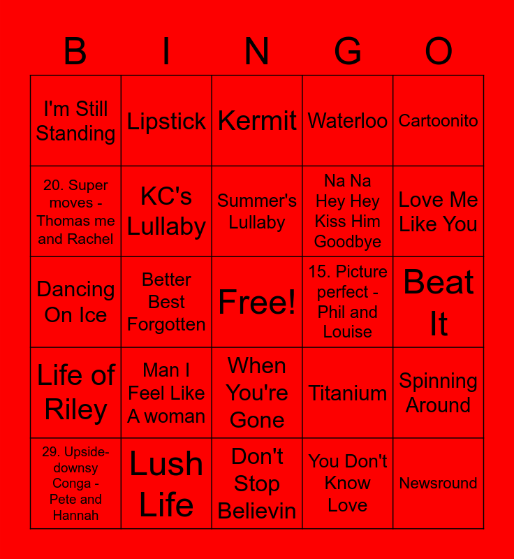 This bingo card has a free space and 401 words: Hi-5, 7. Hero - Me and Rachel, Unpredictable, S Club Party, Cartoonito, Spice Up Your Life, Burn, Night Is Young, Tiger Feet, My Love My Life, Ruff Ruff Tweet and Dave, Tears On My Pillow, 27. Bringing this baby home - Rachel and Brandon, Yoga, Black Magic, Love Ain't Here Anymore, Family, Hair, Sparky Come Back to Me, The Chase, The New Pup, 33. Ready for action - me and Eve, Dynamite, Money Money Money, Ballet, Back For Good, My Love My Life, 50. Weather - me and Flo, Set Fire To The Rain, Kermit, Beat Of My Drum, I'll Stand By You, This Is Me, Slipping Through My Fingers, Story Of My Life, Paw Patrol, Never Forget, Let Me Entertain You, Roar, When You're Gone, So What, Lush Life, Somewhere Only We Know, Dance With Me Tonight, 46. I belong - me and Jo, Rock DJ, Jump, Mamma Mia, Honey Honey, Promise This, Me And My Broken Heart, Fozzie - Me and Thomas, Rehab, We Can't Stop, Wrecking Ball, 45. Mighty Little Gekko - Dave and Amy, 28. A bicycle built for two - James and Brandon, Heroes, I Begin to Wonder, Night Changes, History, Here and Now, 21. Royal Fun - Flo and me, Neon Blue, Long Hot Summer, What Makes You Beautiful, 15. Picture perfect - Phil and Louise, Gimme Gimme Gimme, Music, KC's Lullaby, 9. Super singing Heroes - Rachel and David, 49. I don't know what I've been told - me Rachel Rob and Flo, 56. I'm on the case - me and Rachel, Brave heart, Midnight Memories, Rule The World, Unpredictable, Pretend, Little Me, Relight My Fire, Step Back In Time, Alive, What The Future Holds, Lucky Day, Love Me Like You, So am I, No Good Advice, Airplanes, Steal My Girl, Life of Riley, Nick Jr, 10. Picture You - Flo and Me, Venus, Could It Be Magic, Make Your Own Kind Of Music, Viva Forever, Good Mood, Grenade, YMCA, 25. The summer dances - everyone, The Flood, 12. I've been there buddy - Rob and Rachel, Beat It, 37. Stuffy the Great - Hannah and me, Gonzo - Gio and Jo, Think About Us, Headlines, Nothing Scares Me, Summer Of Love, 55. Chugga chugga - Grace and Rob, Wake Me Up, Summer, Muppet Babies, Something Kinda Ooh, Can't Speak French, Chiquitita, Tobogganing, Loco Motion, I've Been Waiting For You, 2 Hearts, Rewrite The Stars, Say You'll Be Mine, Untouchable, Flames, 53. Hot hot lava - me and Gio, CITV, Shake Your Body, Do They Know It's Christmas, Love Ain't Gonna Wait for You, Please Don't Let Me Go, 47. Summer square dance - Rob me Rachel and Paul, Never Too Late, A Moment Like This, X Factor, Especially For You, 16. Mousekadoer - James and Me, What I've Been Looking For, When All Is Said and Done, Never Had A Dream Come True, Bop To The Top, Cest la Vie, Does Your Mother Know, 24. PJ masks and feeling great - Pete and Andy, I Think Were Alone Now, Pack Up, You Don't Know Love, Who Do You Think You Are, Voulez Vous, SOS, No More Tears Enough, Super Trouper, Summer - me and Rachel, Knowing Me Knowing You, I Believe in You, Love Machine, Animals, 39. Letters - me and Andy, 5678, Andante Andante, Wings, Live While Were Young, Waterloo, 4. Seasons - Rachel and Andy, Tragedy, Never have to say goodbye, Ooh la la, Somebody Else's Guy, 11. Everyday fun - Beckie and Me, Move, With Ur Love, How Will I Know, Nativity 3, Tell Me Ma, You're My Number One, Sometimes, Geno, The Show, Puppy Love, One For Sorrow, 48. Hello Christmas - me and Rachel, 30. Tots Theme - Rob me and Rachel, Patience, Strictly, Cheap Thrills, The Loving Kind, Run, NHSA, Put Yourself In My Place, Shine, Touch, Stomp, Penguin with A Plan, Fly On The Wings of Love, Waterline, Hand On Your Heart, Year 3000, Angel Eyes, Amarillo, 52. Pirates Island hideout - Gio and Rachel, 8. Count on Us - Flo and Hannah, Perfect, Better Best Forgotten, Anymore, CBeebies, Life Got Cold, What Makes You Beautiful, Let Me Down, Stay The Night, Animal - me and Andy, Breaking Free, Amazing Machines, Just Give Me A Reason, UP, DNA, Reach, Young Hearts Run Free, Stayin Alive, Power, Fozzie, Name Of The Game, Lost In Music, Bass Face, Greatest Day, The Promise, 14. Minnie's boutique - me and Elaine, Start up your imagination, Steady and Slow, I Do I Do I Do I Do I Do, Nativity 2, Drag Me Down, Biology, Lay All Your Love On Me, 36. Cedric the Great - rob and Paul, Kids, Love at first sight, I Know him so well, Cha Cha Slide, Goodbye, Dear Darlin, Love Me Like You Do, Sound Of The Underground, Gonzo, Glorious, Salute, Songs, You Are Not Alone, Stomps, Man I Feel Like A woman, Bring It All Back, I Wish It Could Be Xmas, Lazy Song, 29. Upside-downsy Conga - Pete and Hannah, Summer's Lullaby, Jump Jump Star, Disney Junior, Deeper Shade Of Blue, Too Much, Sweet Child O Mine, 58. Hey hey owlette - Rachel and Rob, Footprints in the sand, 44. Never land pirate band - Gio and Beckie, Easier, Our Last Summer, 41. KC's lullaby - me and Rachel, A Million Love Songs, Milkshake, No, Chain Reaction, 26. The hugglemonster way - Rachel and Rob, Two In A Million, Natural, Story Of A Heart, 2 Become 1, PJ Masks, Shout Out To My Ex, Wannabe, I Should be so Lucky, Secret Love Song, Like It, Cry Me A River, I Have A Dream, Feelings, Scared of the Dark, The Masked Singer, Lipstick, Cannonball, Call Me, 38. Make some noise - Grace and me, One Way or Another (Teenage Kicks), See The Day, I'm Still Standing, Reggaeton Lento, 59. I'm Luna girl - me and Rachel, Pray, The Climb, Rolling In The Deep, Wouldn't Change A Thing, I Turn to You, 51. Tap tap tap your feet - me and Beckie, 40. Choo-choo boogie - Rob and James, 32 . Kermit - me and Pete, 34. Perfect slumber party - Ben and me, Don't Stop Movin, If I Were A Boy, Why Did It Have To Be Me, Steady and Slow, 22. Spine Chiller - Ben and Rob, More Than Friends, Here It Comes Again, Is It True, Mama, Thank You For The Music, No More Sad Songs, Heartbreak In This City, Someone You Loved, Spinning Around, Happy Now, Hallelujah, The Winner Takes It All, Dancing On Ice, Euphoria, 17. Walking the plank - Andy and Rob, Newsround, Smile Please, At Last, Heartbeat, The Scientist, Colours, Eurovis