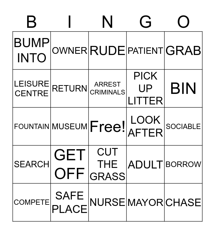 This bingo card has a free space and 24 words: GET OFF, SAFE PLACE, ARREST CRIMINALS, COMPETE, GRAB, BUMP INTO, LEISURE CENTRE, OWNER, LOOK AFTER, CUT THE GRASS, PICK UP LITTER, FOUNTAIN, ADULT, BORROW, RETURN, MAYOR, SOCIABLE, RUDE, BIN, MUSEUM, CHASE, SEARCH, PATIENT and NURSE.