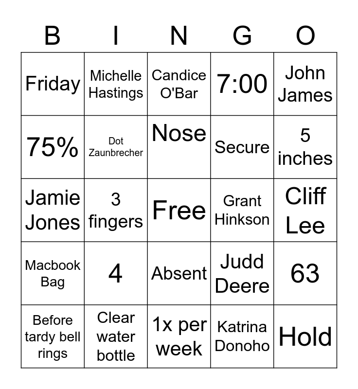 This bingo card has a free space and 54 words: 10 minutes, Macbook Bag, 7:30, Tardy, Absent, 7:20, 7:00, 1 week, 75%, 15-20%, Friday, School Spirit, Clear water bottle, Before tardy bell rings, Mr. Barger, 1x per week, Hold, Secure, Lockdown, Cliff Lee, Judd Deere, Lacy Landers, Grant Hinkson, John James, Shane Whitlock, Michelle Hastings, Kristin Ginther, Suzanne Owen, Darci Stoll, Katrina Donoho, Meagan McGuire, Todd Bevill, Harris, Cameron Phillips, Candice O'Bar, Jenna White, Jamie Jones, 63, Mitch Meredith, Dot Zaunbrecher, Monica Bailey, Panthers, Steve Landers, Peyton Pallette, 4, 2, Unlimited, Ears, Nose, 3 fingers, 5 inches, Saturday School, DH and 2 days.