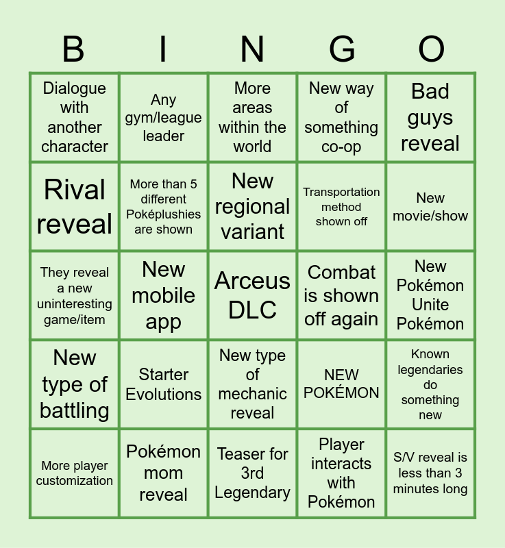 This bingo card has 25 words: Starter Evolutions, Teaser for 3rd Legendary, New regional variant, More player customization, Bad guys reveal, Dialogue with another character, Rival reveal, Any gym/league leader, Combat is shown off again, New type of mechanic reveal, Transportation method shown off, They reveal a new uninteresting game/item, NEW POKÉMON, Known legendaries do something new, More than 5 different Poképlushies are shown, S/V reveal is less than 3 minutes long, New Pokémon Unite Pokémon, More areas within the world, New movie/show, New mobile app, Arceus DLC, Pokémon mom reveal, New type of battling, New way of something co-op and Player interacts with Pokémon.