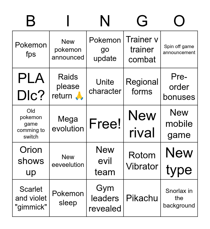 This bingo card has a free space and 24 words: New eeveelution, Pokemon sleep, Unite character, Scarlet and violet "gimmick", Spin off game announcement, Pokemon fps, PLA Dlc?, New pokemon announced, New rival, New evil team, Regional forms, Old pokemon game comming to switch, Rotom Vibrator, New type, Raids please return 🙏, Pikachu, New mobile game, Pokemon go update, Pre-order bonuses, Mega evolution, Snorlax in the background, Orion shows up, Trainer v trainer combat and Gym leaders revealed.