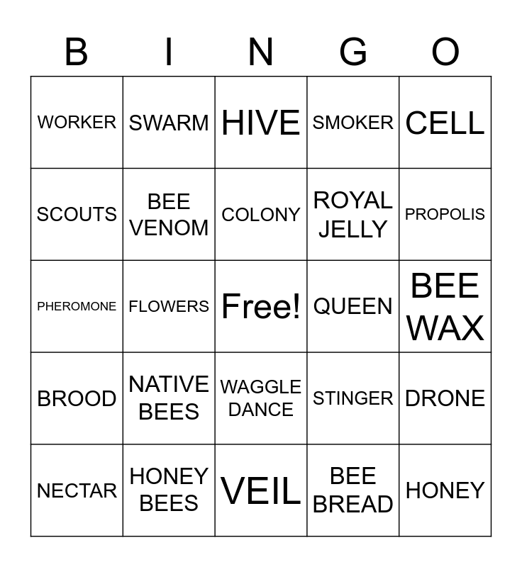 This bingo card has a free space and 24 words: NATIVE BEES, HONEY BEES, COLONY, NECTAR, CELL, WORKER, SCOUTS, SWARM, QUEEN, WAGGLE DANCE, ROYAL JELLY, PHEROMONE, STINGER, DRONE, BEE VENOM, BEE BREAD, BEE WAX, HIVE, PROPOLIS, FLOWERS, HONEY, BROOD, SMOKER and VEIL.