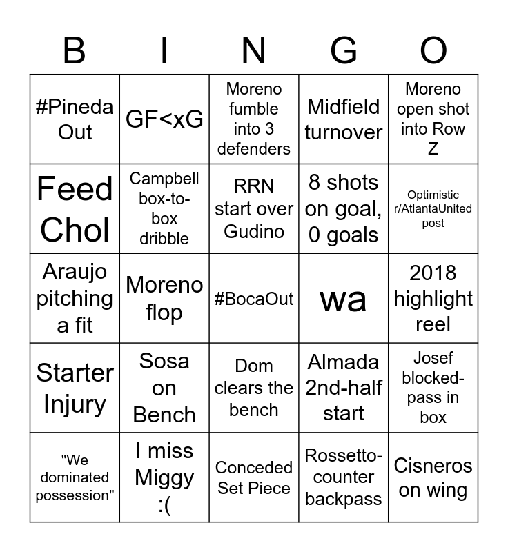 This bingo card has a free space and 24 words: Sosa on Bench, I miss Miggy :(, RRN start over Gudino, "We dominated possession", Moreno open shot into Row Z, #Pineda Out, Feed Chol, GF<xG, wa, Dom clears the bench, 8 shots on goal, 0 goals, Araujo pitching a fit, Almada 2nd-half start, Josef blocked-pass in box, Campbell box-to-box dribble, Rossetto-counter backpass, 2018 highlight reel, Moreno fumble into 3 defenders, Optimistic r/AtlantaUnited post, Moreno flop, Cisneros on wing, Starter Injury, Midfield turnover and Conceded Set Piece.