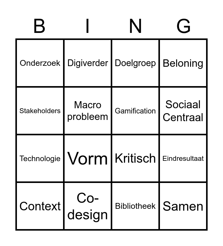 This bingo card has 36 words: Kinderen, Bewust, Activeren, Gamification, Co-creatie, Samen, Sociaal Centraal, Social Design, Stakeholders, Proces, Eindresultaat, Beloning, 9 en 10-jarigen, Co-design, Vorm, Onderzoek, Nieuwsgierig, Materiaal, Context, Doelgroep, Bibliotheek, Ouders, Emoticon, Digitaal meedoen, Digistarter, Digiverder, Kritisch, Schermtijd, Technologie, Macro probleem, Micro oplossing, Manon, Maakkracht, Ontwerpkansen, Positief and Prikkelen.