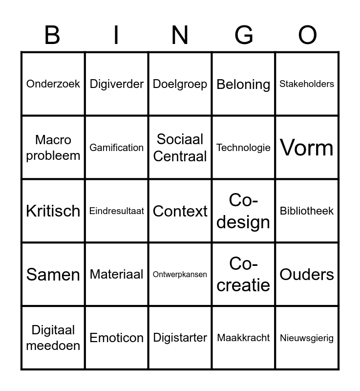This bingo card has 36 words: Kinderen, Bewust, Activeren, Gamification, Co-creatie, Samen, Sociaal Centraal, Social Design, Stakeholders, Proces, Eindresultaat, Beloning, 9 en 10-jarigen, Co-design, Vorm, Onderzoek, Nieuwsgierig, Materiaal, Context, Doelgroep, Bibliotheek, Ouders, Emoticon, Digitaal meedoen, Digistarter, Digiverder, Kritisch, Schermtijd, Technologie, Macro probleem, Micro oplossing, Manon, Maakkracht, Ontwerpkansen, Positief and Prikkelen.
