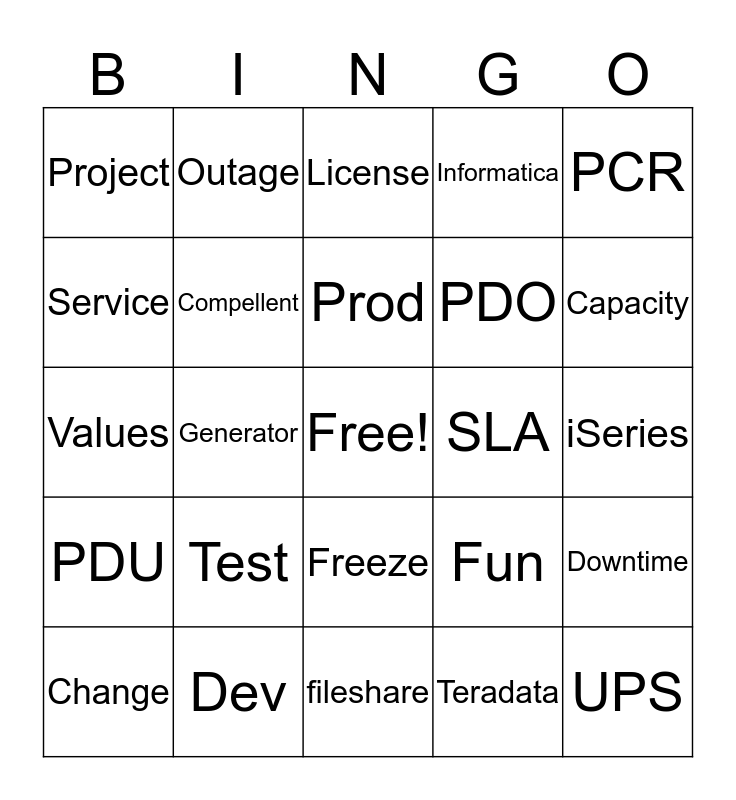 This bingo card has a free space and 24 words: Test, Dev, Prod, Change, PCR, Project, Service, Outage, SLA, Freeze, PDO, Values, Fun, Downtime, Compellent, Teradata, iSeries, License, Capacity, Generator, UPS, PDU, Informatica and fileshare.