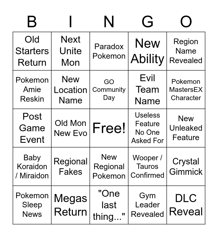 This bingo card has a free space and 24 words: Regional Fakes, Megas Return, GO Community Day, Pokemon Sleep News, Region Name Revealed, Old Starters Return, Pokemon Amie Reskin, Next Unite Mon, Useless Feature No One Asked For, New Regional Pokemon, Evil Team Name, Post Game Event, Wooper / Tauros Confirmed, Crystal Gimmick, New Location Name, Gym Leader Revealed, New Unleaked Feature, Paradox Pokemon, Pokemon MastersEX Character, Old Mon New Evo, DLC Reveal, Baby Koraidon / Miraidon, New Ability and "One last thing...".