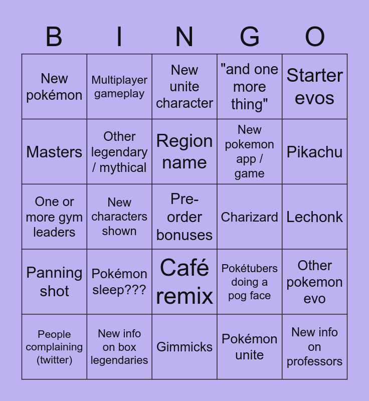 This bingo card has 25 words: Pokémon sleep???, Gimmicks, Region name, People complaining (twitter), Starter evos, New pokémon, Masters, Multiplayer gameplay, Charizard, Café remix, New pokemon app / game, One or more gym leaders, Pokétubers doing a pog face, Other pokemon evo, Other legendary / mythical, New info on professors, Lechonk, New unite character, Pikachu, New characters shown, Pre-order bonuses, New info on box legendaries, Panning shot, "and one more thing" and Pokémon unite.