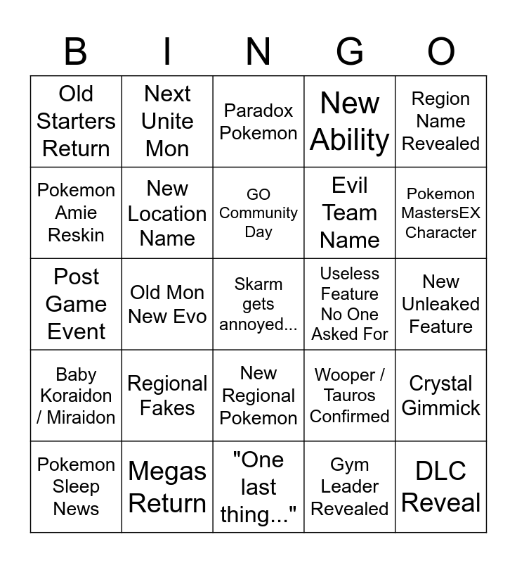 This bingo card has a free space and 24 words: Regional Fakes, Megas Return, GO Community Day, Pokemon Sleep News, Region Name Revealed, Old Starters Return, Pokemon Amie Reskin, Next Unite Mon, Useless Feature No One Asked For, New Regional Pokemon, Evil Team Name, Post Game Event, Wooper / Tauros Confirmed, Crystal Gimmick, New Location Name, Gym Leader Revealed, New Unleaked Feature, Paradox Pokemon, Pokemon MastersEX Character, Old Mon New Evo, DLC Reveal, Baby Koraidon / Miraidon, New Ability and "One last thing...".
