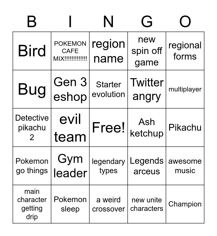 This bingo card has a free space and 24 words: Gym leader, Pokemon sleep, Starter evolution, main character getting drip, regional forms, Bird, Bug, POKEMON CAFE MIX!!!!!!!!!!!!!, Ash ketchup, legendary types, Twitter angry, Detective pikachu 2, Legends arceus, awesome music, Gen 3 eshop, new unite characters, Pikachu, region name, multiplayer, evil team, Champion, Pokemon go things, new spin off game and a weird crossover.