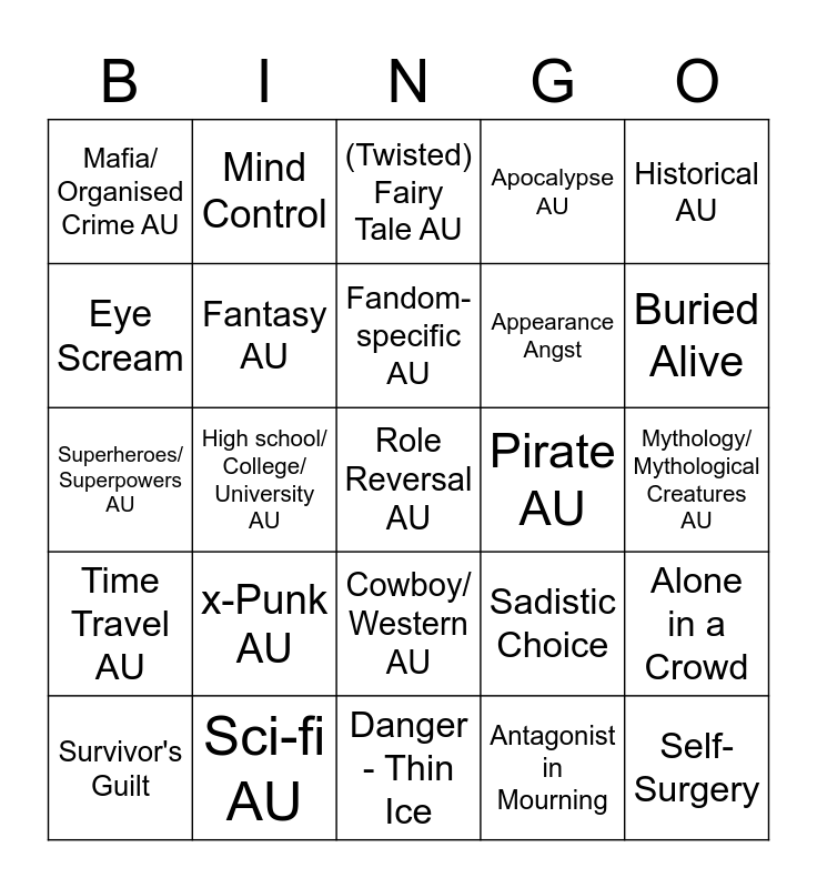 This bingo card has 40 words: Alpha/ Beta/ Omega AU, Superheroes/ Superpowers AU, Soulmate/ Soulmarks AU, Fantasy AU, Sci-fi AU, Cowboy/ Western AU, Fandom-specific AU, Fusion Crossover AU, Historical AU, Time Travel AU, High school/ College/ University AU, Apocalypse AU, Role Reversal AU, Mythology/ Mythological Creatures AU, Pirate AU, x-Punk AU, Childhood Friends AU, Mafia/ Organised Crime AU, Alternate Employment AU, (Twisted) Fairy Tale AU, Alone in a Crowd, Antagonist in Mourning, Appearance Angst, Eye Scream, Big "Why?!", Broken Hero, Heal It With Booze, Despair Event Horizon, Self-Surgery, My God, What Have I Done?, Rage Against the Reflection, Survivor's Guilt, Hanahaki Disease, Sadistic Choice, Buried Alive, Danger - Thin Ice, Mortal Wound Reveal, Rasputinian Death, Mind Control and Choke Holds.