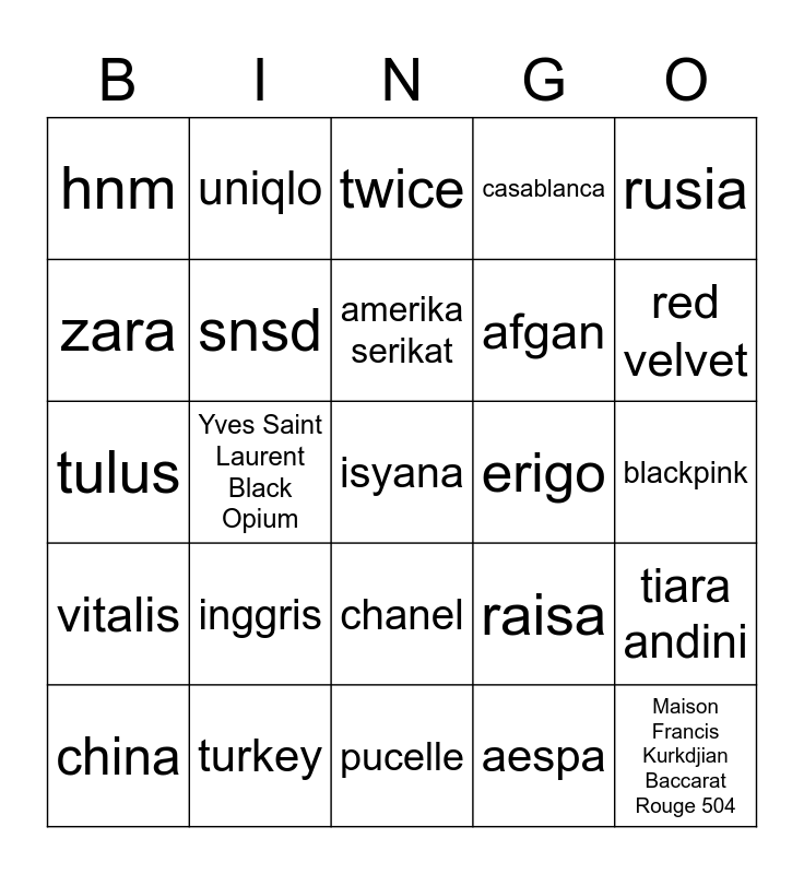 This bingo card has a free space and 24 words: inggris, turkey, amerika serikat, china, rusia, hnm, zara, uniqlo, erigo, chanel, afgan, tulus, raisa, tiara andini, snsd, aespa, blackpink, twice, red velvet, Yves Saint Laurent Black Opium, Maison Francis Kurkdjian Baccarat Rouge 504, vitalis, casablanca and pucelle.