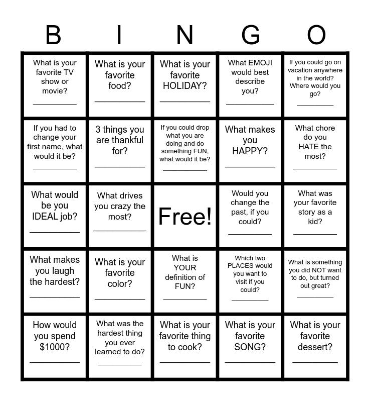 This bingo card has a free space and 24 words: What is your favorite color? __________, What was the hardest thing you ever learned to do? __________, If you could drop what you are doing and do something FUN, what would it be? ____________, How would you spend $1000? __________, If you could go on vacation anywhere in the world? Where would you go? __________, What is your favorite TV show or movie? __________, If you had to change your first name, what would it be? __________, What is your favorite food? __________, Would you change the past, if you could? __________, What is YOUR definition of FUN? __________, What makes you HAPPY? __________, What would be you IDEAL job? __________, Which two PLACES would you want to visit if you could? __________, What is something you did NOT want to do, but turned out great? __________, 3 things you are thankful for? __________, What is your favorite SONG? __________, What was your favorite story as a kid? __________, What is your favorite HOLIDAY? __________, What chore do you HATE the most? __________, What drives you crazy the most? ___________, What is your favorite dessert? _________, What makes you laugh the hardest? __________, What EMOJI would best describe you? ___________ and What is your favorite thing to cook? __________.