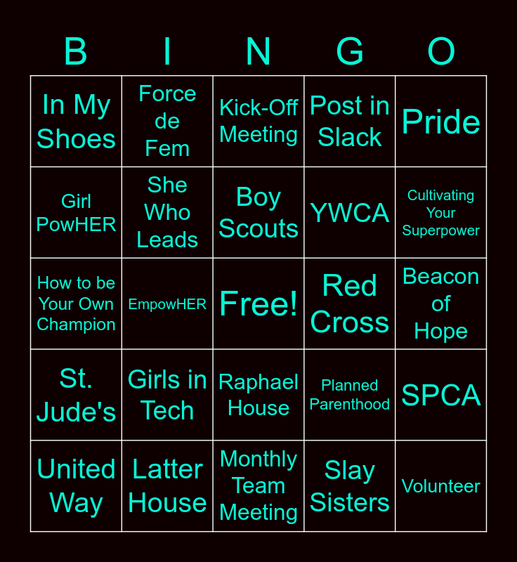 This bingo card has a free space and 53 words: Community Challenge, Volunteer, Donate, Slay Sisters, Girls in Tech, Comeback Squad, Force de Fem, Global Gals, Girl PowHER, Equality Now, She Who Leads, Mary's Shelter, SPCA, Planned Parenthood, Special Olympics, United Way, Boy Scouts, Red Cross, Meals on Wheels, Pride, EmpowHER, Nonprofit, YWCA, In My Shoes, Black Girls Code, Latter House, Food Bank, Homeless Shelter, Soup Kitchen, Cultivating Your Superpower, Code Names, Networking, Global 5K, Big Brothers, Big Sisters, Girl Scouts, Post in Slack, Monthly Team Meeting, Kick-Off Meeting, Host an Event, Charities, Friends of Animals, Beacon of Hope, Classroom Central, Riding for the Disabled, Raphael House, Walk a Mile in Her Shoes, Girl PowHER Game Hour, How to be Your Own Champion, St. Jude's, Donate Through Gusto, PillHERs and Feed my Sheep.