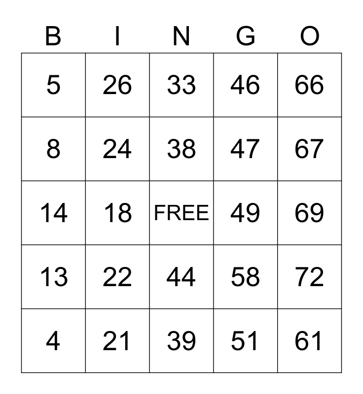 This bingo card has a free space and 56 words: 2, 17, 31, 46, 61, 4, 18, 32, 47, 62, 5, 19, 48, 63, 7, 20, 33, 49, 65, 8, 21, 34, 51, 66, 12, 22, 35, 53, 67, 13, 23, 37, 54, 68, 14, 24, 38, 55, 69, 26, 39, 57, 70, 27, 40, 58, 72, 28, 42, 59, 73, 29, 43, 75, 44 and 45.