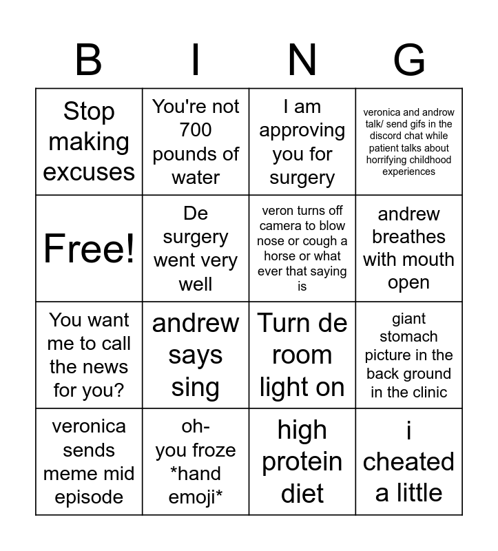 This bingo card has 16 words: oh- you froze *hand emoji*, giant stomach picture in the back ground in the clinic, I am approving you for surgery, Stop making excuses, You want me to call the news for you?, You're not 700 pounds of water, Turn de room light on, high protein diet, Free!, De surgery went very well, veronica sends meme mid episode, veronica and androw talk/ send gifs in the discord chat while patient talks about horrifying childhood experiences, andrew says sing, andrew breathes with mouth open, veron turns off camera to blow nose or cough a horse or what ever that saying is and i cheated a little.