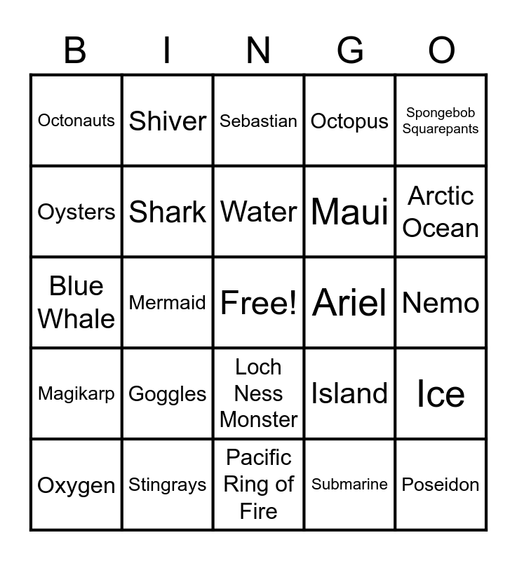 This bingo card has a free space and 40 words: Atlantis, Blue Whale, Whale Shark, Shark, Stingrays, Loch Ness Monster, Water, Pacific, Spongebob Squarepants, Magikarp, Mermaid, Octopus, Poseidon, Nemo, Ariel, Goggles, Katara, Octonauts, Titanic, Sebastian, Ice, Submarine, Maui, Oysters, Plankton, Manatees, Orca, Narwhals, Mariana Trench, Goldfish, The Rainbow Fish, Oxygen, Sailboat, Island, Arctic Ocean, Pacific Ring of Fire, 50%, Atlantic Ocean, Shiver and Coral.