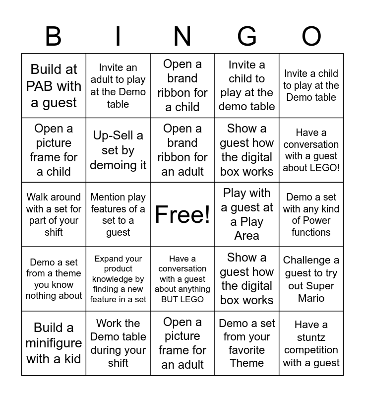 This bingo card has a free space and 24 words: Expand your product knowledge by finding a new feature in a set, Work the Demo table during your shift, Open a brand ribbon for an adult, Build a minifigure with a kid, Invite a child to play at the Demo table, Build at PAB with a guest, Open a picture frame for a child, Invite an adult to play at the Demo table, Play with a guest at a Play Area, Have a conversation with a guest about anything BUT LEGO, Show a guest how the digital box works, Walk around with a set for part of your shift, Show a guest how the digital box works, Challenge a guest to try out Super Mario, Up-Sell a set by demoing it, Demo a set from your favorite Theme, Demo a set with any kind of Power functions, Open a brand ribbon for a child, Have a conversation with a guest about LEGO!, Mention play features of a set to a guest, Have a stuntz competition with a guest, Demo a set from a theme you know nothing about, Invite a child to play at the demo table and Open a picture frame for an adult.