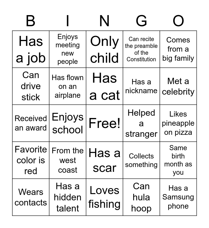 This bingo card has a free space and 24 words: From the west coast, Has a hidden talent, Has a cat, Wears contacts, Comes from a big family, Has a job, Can drive stick, Enjoys meeting new people, Helped a stranger, Has a scar, Has a nickname, Received an award, Collects something, Same birth month as you, Has flown on an airplane, Can hula hoop, Likes pineapple on pizza, Only child, Met a celebrity, Enjoys school, Has a Samsung phone, Favorite color is red, Can recite the preamble of the Constitution and Loves fishing.
