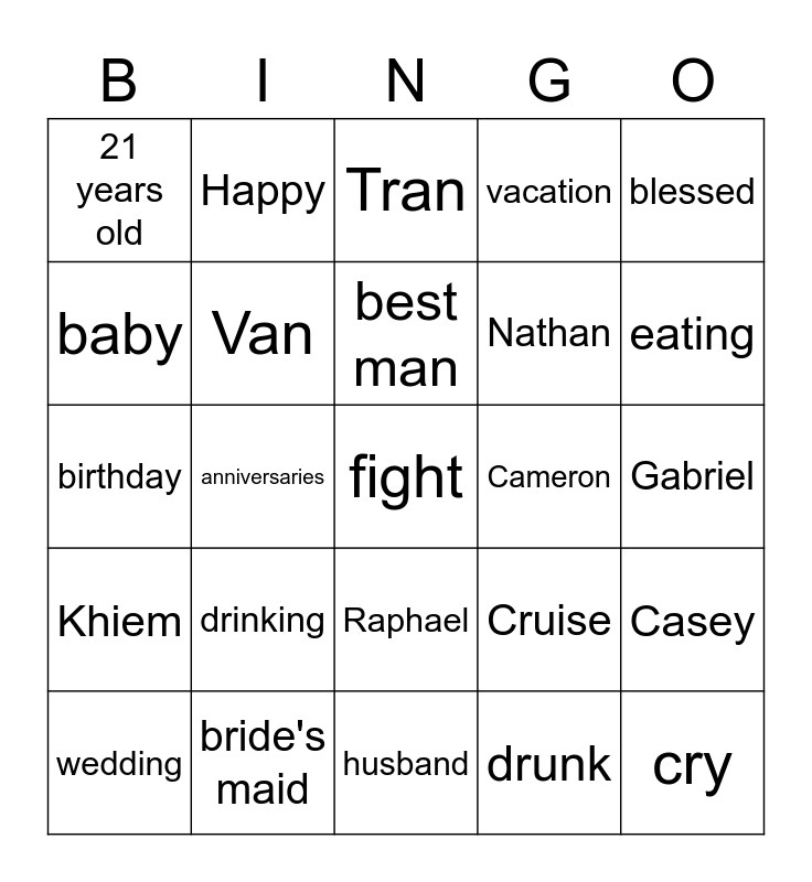 This bingo card has 103 words: Free!, student loan, blessed, Thankful, 16 yeas old, congratulations, graduation, working, healthy, good choice, making money, candles, cake, kiss, love, Ly, Tran, good food, beer, wine, college, high school, testing, ring boy, dancing, drinking, eating, vacation, honey moon, Dominican Republic, Cruise, drunk, best wish, career, Chau, Nghia, Oanh, friends, best man, bride's maid, flower girl, Khiem, pregnant, baby, children, 21 years old, 19 years old, fight, laugh, cry, propose, Nga, Bac Nga, Mimi, Tuan, Athena, Dalton, Kim Lien, Ramon, Raphael, Gabriel, back to school, fun, summer, hot, sunny, beach, Happy, birthday, anniversaries, husband, wife, kids, son, daughter, twin, giving birth, wedding, celebration, party, gifts, Ngoc, Van, Valerie, Cameron, Grace, Tram, Hung, Derrick, Hanna, Diem, Khanh, Casey, Quan, Tony, Nicky, Nathan, Monica, Benjamin, Lan, Ricky, mom and dad.