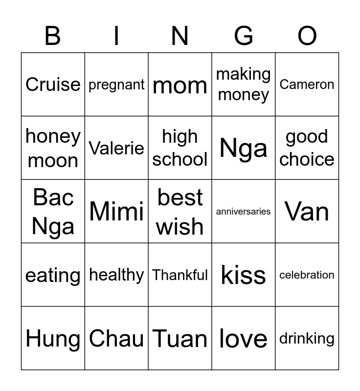 This bingo card has 106 words: Free!, Valerie, Cameron, Grace, Hanna, Diem, Khanh, Casey, Quan, Tony, Nicky, Nathan, Monica, Benjamin, Lan, Ricky, mom, dad, student loan, blessed, Thankful, 16 yeas old, congratulations, graduation, working, healthy, good choice, making money, candles, cake, kiss, love, Ly, Tran, good food, beer, wine, college, high school, testing, ring boy, dancing, drinking, eating, vacation, honey moon, Dominican Republic, Cruise, drunk, best wish, career, Chau, Nghia, Oanh, friends, best man, bride's maid, flower girl, Khiem, pregnant, baby, children, 21 years old, 19 years old, fight, laugh, cry, propose, Nga, Bac Nga, Mimi, Tuan, Athena, Dalton, Kim Lien, Ramon, Raphael, Gabriel, back to school, fun, summer, hot, sunny, beach, Happy, birthday, anniversaries, husband, wife, kids, son, daughter, twin, giving birth, wedding, celebration, party, gifts, Ngoc, Van, Valerie, Cameron, Grace, Tram, Hung and Derrick.