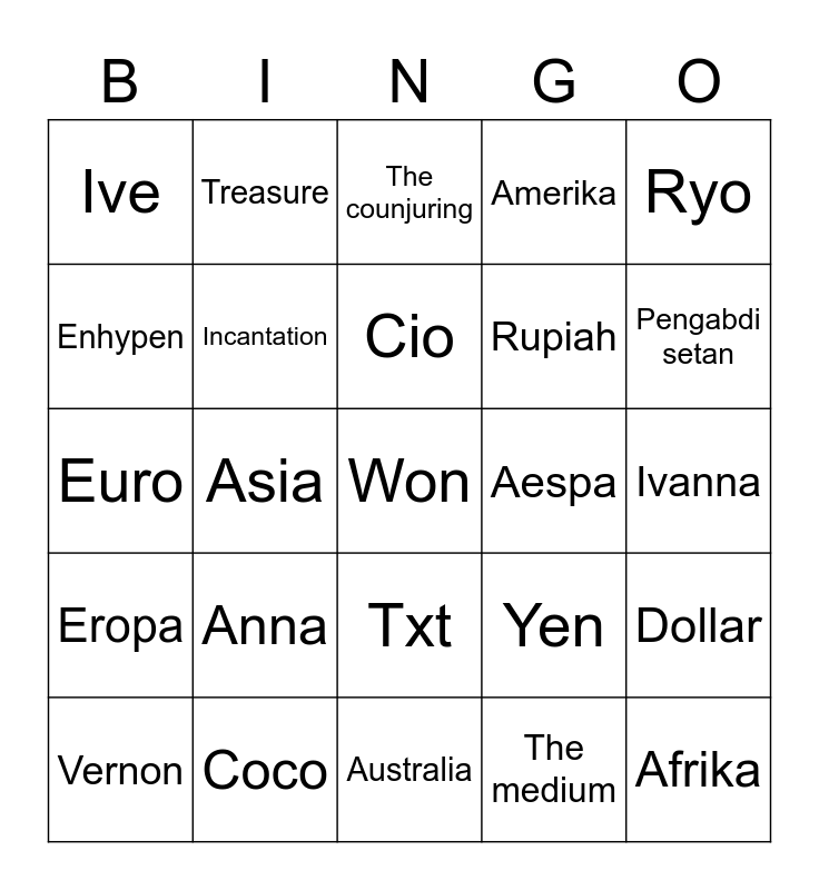This bingo card has a free space and 24 words: Anna, Coco, Cio, Vernon, Ryo, Ive, Enhypen, Treasure, Aespa, Txt, Rupiah, Euro, Yen, Dollar, Incantation, The medium, Ivanna, The counjuring, Pengabdi setan, Asia, Afrika, Eropa, Amerika and Australia.