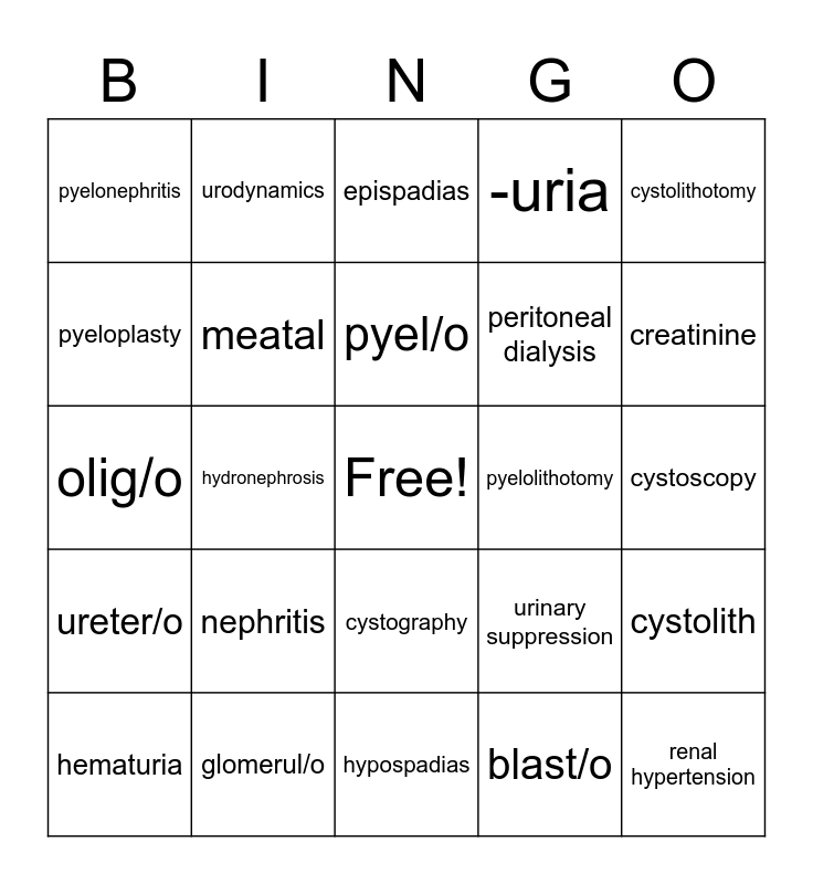 This bingo card has a free space and 124 words: albumin/o, hydr/o, ren/o, -esis, azot/o, lith/o, ureter/o, -iasis, blast/o, meat/o, urethr/o, -lysis, cyst/o, nephr/o, ur/o, -ptosis, glomerul/o, noct/i, urin/o, -rrhaphy, glyc/o, olig/o, vesic/o, -tripsy, glycos/o, pyel/o, -uria, azotemia, cystitis, cystocele, cystolith, glomerulonephritis, hydronephrosis, nephritis, nephroblastoma, nephrolithiasis, nephroma, nephromegaly, nephroptosis, pyelitis, pyelonephritis, ureteritis, ureterocele, ureterolithiasis, ureterostenosis, urethrocystitis, cystectomy, cystolithotomy, cystorrhaphy, cystostomy, cystotomy, lithotripsy, meatotomy, nephrectomy, nephrolithotomy, nephrolithotripsy, nephrolysis, nephropexy, nephrostomy, pyelolithotomy, pyeloplasty, ureterectomy, ureterostomy, urethroplasty, vesicourethral suspension, vesicotomy, cystogram, cystography, cystoscope, cystoscopy, nephrography, nephroscopy, nephrosonography, renogram, retrograde urogram, ureteroscopy, urogram, voiding cystourethrography (VCUG), albuminuria, anuria, diuresis, dysuria, glycosuria, hematuria, meatal, nephrologist, nephrology, nocturia, oliguria, polyuria, pyuria, urinary, urologist, urology, epispadias, hypospadias, polycystic kidney disease, renal calculus (pl. calculi), renal failure, renal hypertension, urinary retention, urinary suppression, urinary tract infection (UTI), extracorporeal shock wave lithotripsy (ESWL), fulguration, renal transplant, blood urea nitrogen (BUN), creatinine, KUB, specific gravity (SG), urinalysis (UA), catheter (cath), distended, electrolytes, enuresis, hemodialysis (HD), incontinence, micturate, peritoneal dialysis, stricture, urinal, urinary catheterization, urodynamics and void.