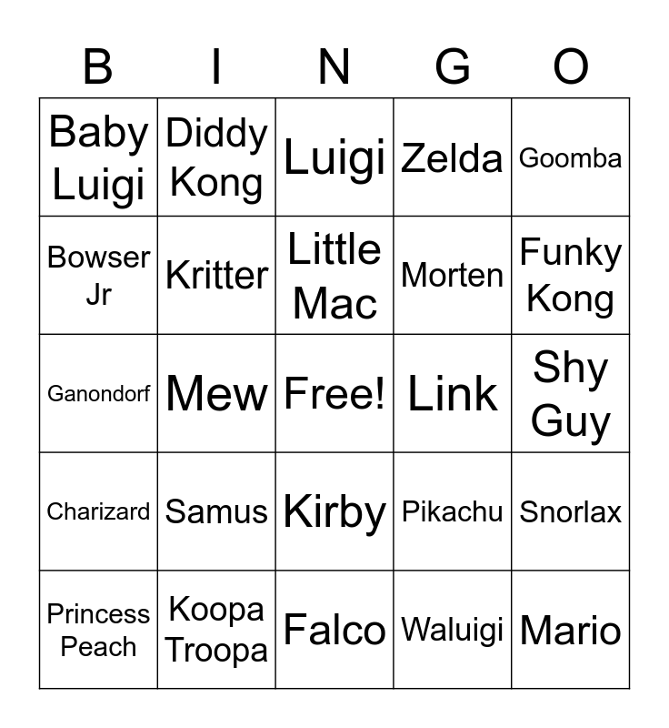 This bingo card has a free space and 43 words: Bowser, Mario, Donkey Kong, Princess Peach, Wario, Waluigi, Luigi, Toad, Goomba, Koopa Troopa, Zelda, Link, Kirby, Samus, Yoshi, Falco, Fox, Ganondorf, Captain Falcon, Funky Kong, Diddy Kong, King K Rool, Toadette, Baby Luigi, Baby Mario, Shy Guy, Dixie Kong, Sheik, Pikachu, Charizard, Blastoise, Snorlax, Mewtwo, Mew, King Dedede, Captain Olimar, Mr. Game and Watch, Little Mac, Bowser Jr, Morten, Dry Bones, Kritter and Daisy.
