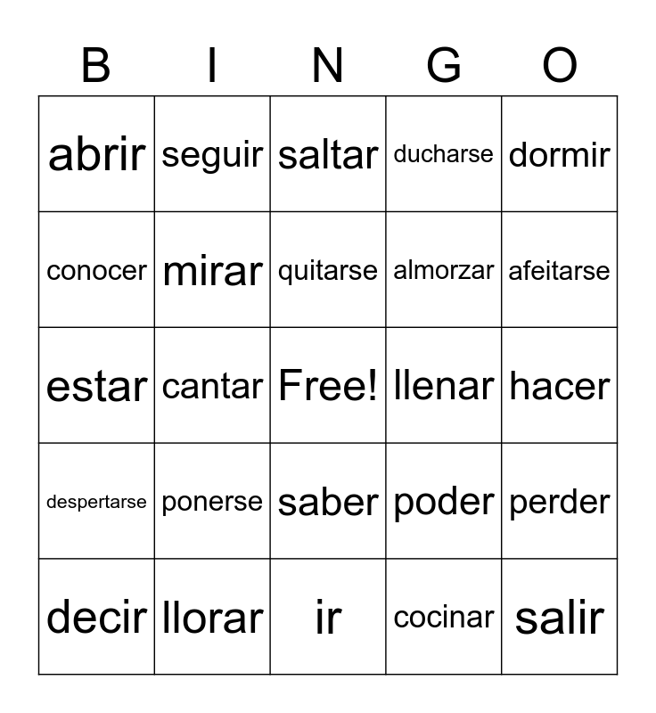 This bingo card has a free space and 29 words: decir, traer, cantar, pedir, abrir, saltar, mirar, ponerse, llenar, llorar, hacer, salir, ir, cocinar, afeitarse, conducir, saber, despertarse, dormir, estar, poder, empezar, almorzar, conocer, ducharse, seguir, perder, quitarse and tomar.