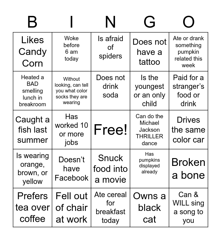 This bingo card has a free space and 24 words: Doesn’t have Facebook, Fell out of chair at work, Does not drink soda, Prefers tea over coffee, Ate or drank something pumpkin related this week, Likes Candy Corn, Heated a BAD smelling lunch in breakroom, Woke before 6 am today, Can do the Michael Jackson THRILLER dance, Snuck food into a movie, Is the youngest or an only child, Caught a fish last summer, Has pumpkins displayed already, Broken a bone, Without looking, can tell you what color socks they are wearing, Owns a black cat, Drives the same color car, Is afraid of spiders, Paid for a stranger’s food or drink, Has worked 10 or more jobs, Can & WILL sing a song to you, Is wearing orange, brown, or yellow, Does not have a tattoo and Ate cereal for breakfast today.