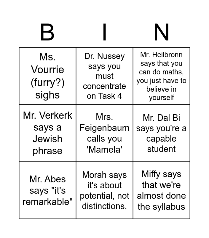 This bingo card has 10 words: Morah says it's about potential, not distinctions., Mr. Heilbronn says that you can do maths, you just have to believe in yourself, Ms. Vourrie (furry?) sighs, Mrs. Feigenbaum calls you 'Mamela', Mr. Verkerk says a Jewish phrase, Mr. Abes says "it's remarkable", Dr. Nussey says you must concentrate on Task 4, Morah Stern says you need to learn ready made sentences, Mr. Dal Bi says you're a capable student and Miffy says that we're almost done the syllabus.