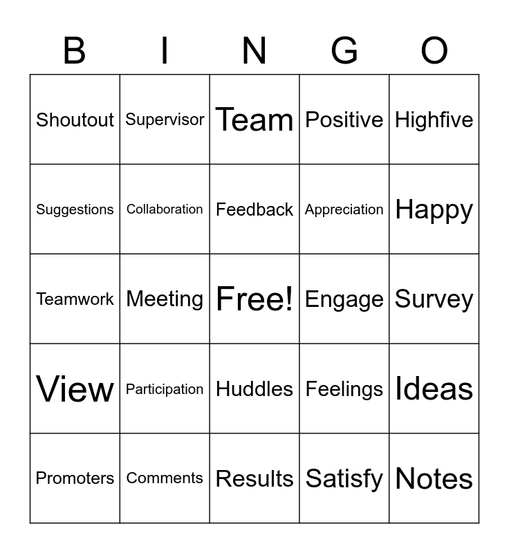 This bingo card has a free space and 25 words: Participation, Results, Feedback, Promoters, Highfive, Shoutout, Suggestions, Supervisor, Engage, Huddles, Appreciation, Teamwork, Feelings, Ideas, Collaboration, Efforts, Survey, Team, Happy, Meeting, Notes, Comments, View, Positive and Satisfy.
