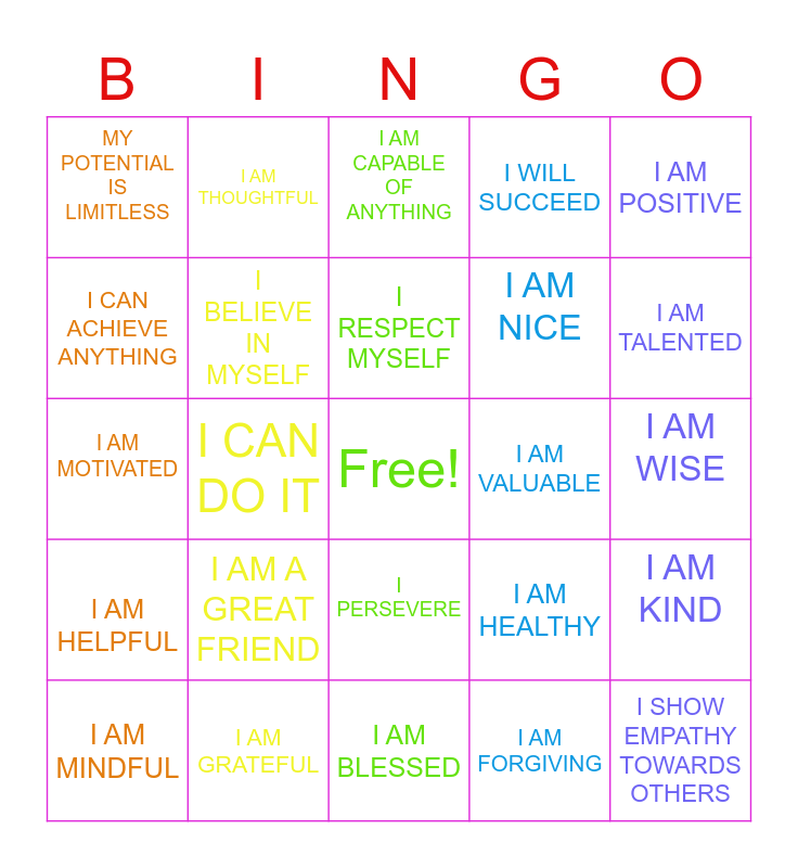 This bingo card has a free space and 24 words: I AM MINDFUL, I AM A GREAT FRIEND, I RESPECT MYSELF, I AM FORGIVING, I AM POSITIVE, MY POTENTIAL IS LIMITLESS, I AM THOUGHTFUL, I AM CAPABLE OF ANYTHING, I AM VALUABLE, I AM WISE, I AM MOTIVATED, I BELIEVE IN MYSELF, I AM HEALTHY, I AM KIND, I CAN ACHIEVE ANYTHING, I AM GRATEFUL, I AM BLESSED, I WILL SUCCEED, I AM TALENTED, I AM HELPFUL, I CAN DO IT, I PERSEVERE, I AM NICE and I SHOW EMPATHY TOWARDS OTHERS.