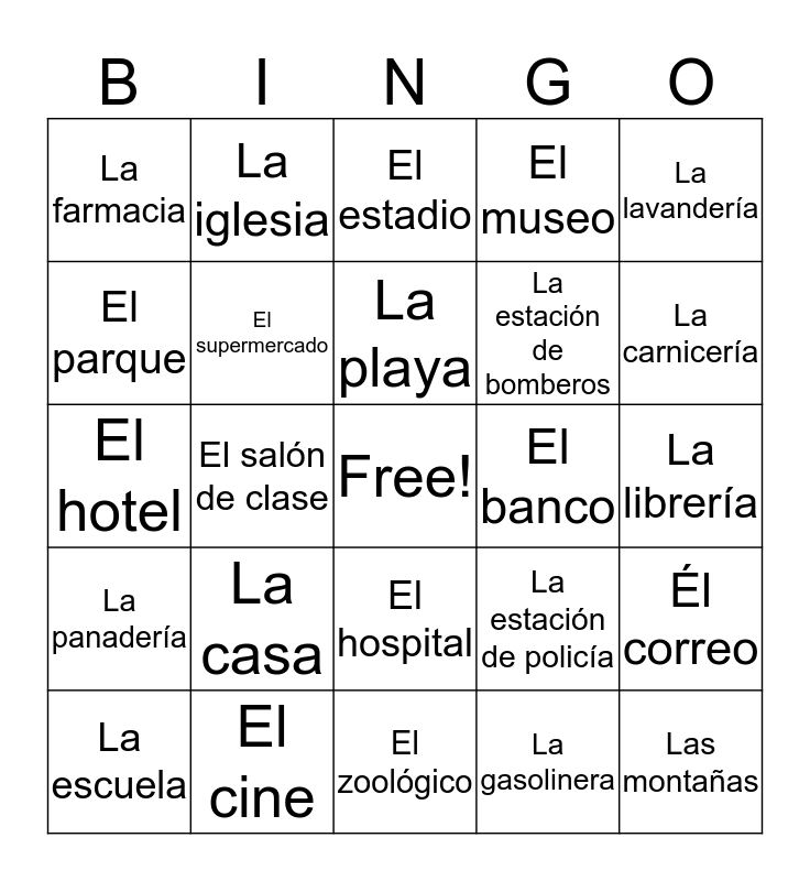 This bingo card has a free space and 24 words: La casa, El cine, La playa, La escuela, La lavandería, La farmacia, El parque, La iglesia, El banco, El hospital, La estación de bomberos, El hotel, La estación de policía, Él correo, El supermercado, La gasolinera, La librería, El estadio, La carnicería, El salón de clase, Las montañas, La panadería, El museo and El zoológico.