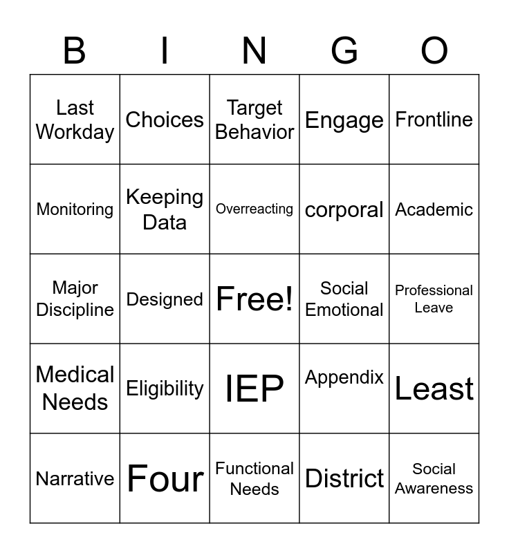 This bingo card has a free space and 29 words: Narrative, 60, Designed, Confidentiality, Last Workday, Target Behavior, Keeping Data, Eligibility, Social Emotional, Four, Professional Leave, Social Awareness, Functional Needs, District, Academic, Ethical, IEP, Medical Needs, Frontline, Major Discipline, Appendix, Observation, corporal, Monitoring, Engage, Choices, Least, Overreacting and Dress.