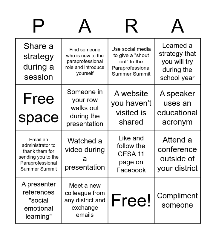 This bingo card has 17 words: Free!, A presenter references "social emotional learning", Use social media to give a "shout out" to the Paraprofessional Summer Summit, Share a strategy during a session, Watched a video during a presentation, Learned a strategy that you will try during the school year, Attend a conference outside of your district, A website you haven't visited is shared, A speaker uses an educational acronym, Someone in your row walks out during the presentation, Meet a new colleague from any district and exchange emails, Like and follow the CESA 11 page on Facebook, Free space, Find someone who is new to the paraprofessional role and introduce yourself, Email an administrator to thank them for sending you to the Paraprofessional Summer Summit, Sit with someone you don't know at lunch and Compliment someone.